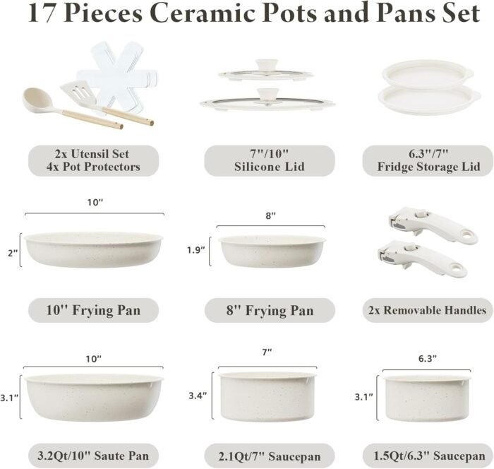 Ceramic Nonstick Cookware Set, Healthy,Non Toxic,17-Pieces Pots and Pans Set Removable Handles,Induction RV Kitchen Set,Stain & Scratch-resistant,Dishwasher/Oven Safe,PFAS/PFOA Free,Cream White
