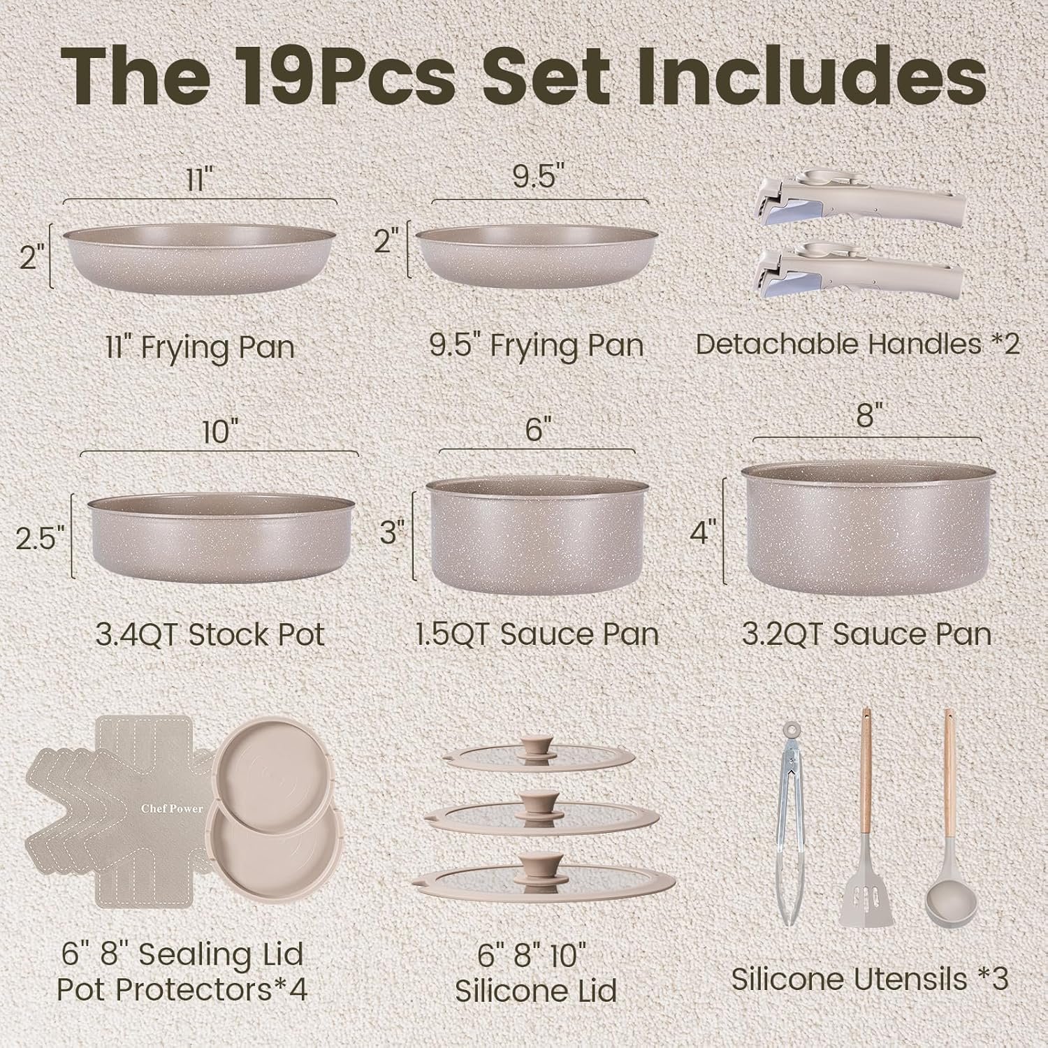 19 Pcs Cookware Set Includes- 1.5 QT SAUCEPAN, 3.2 QT SAUCEPAN, 3.4 QT STOCK POT, 9” FRYING PAN, 11” FRYING PAN, 6”-8”-10” SILICONE LIDS, DETACHABLE HANDLE* 2, SILICONE SLOTTED TURNER, SILICONE LADLE, SILICONE LOCKING TONG, POT PROTECTORS*4