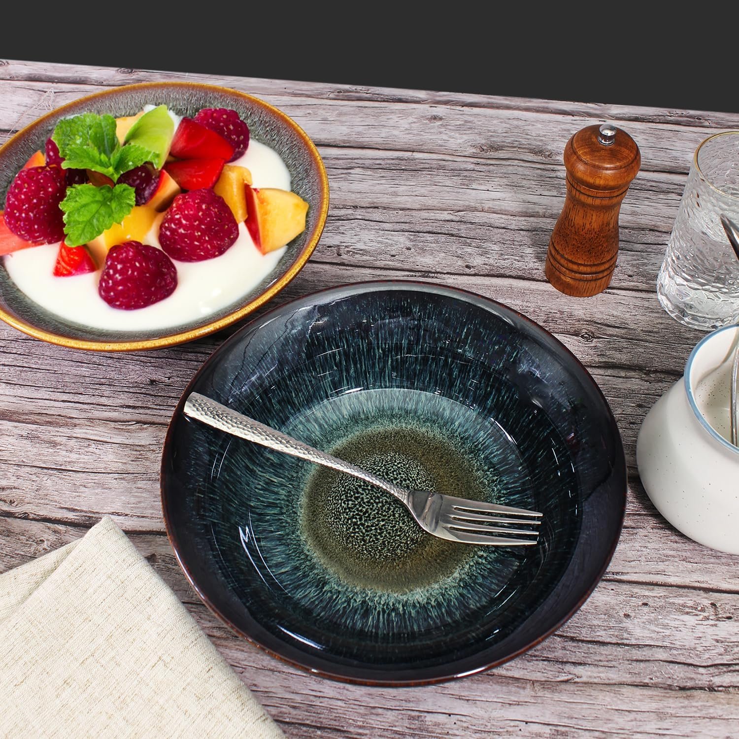 Be the first to review “Ceramic Pasta Bowls Set of 2, 3 quart Large Salad Bowls, Deep Wide Mouth Bowl Easy to stir, for Soup, Fruits, Serving, Kitchen Dinnerware, Dishwasher Microwave Safe, Black reactive glaze”