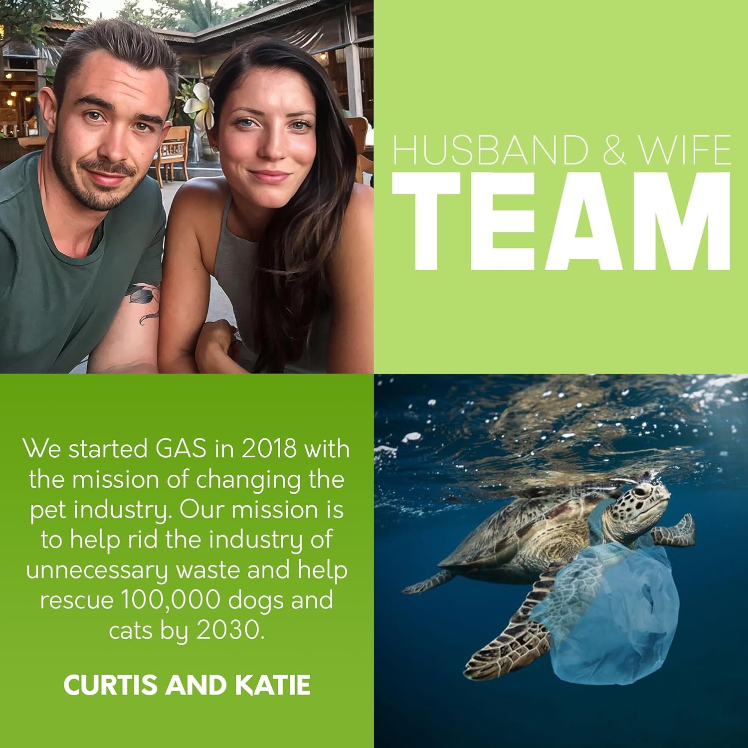 SMALL BUSINESS WITH A BIG HEART – Founded in 2018 by Curtis and Katie, a dynamic husband and wife duo, G.A.S is not just our business – it’s our passion. Dedicated to revolutionizing the pet industry, our small team is big on making a positive impact on the planet and helping animals in need. It’s our mission to rescue 100,000 animals before the end of 2026.