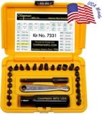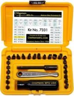 1 Chapman mini ratchet 1 extension: 3 5/8″ 1 screwdriver handle 2 Phillips bits: #1, #2 1 socket adapter: 1/4″ 11 SAE Allen Hex bits: .050″, 1/16″, 5/64″, 3/32″, 7/64″, 1/8″, 9/64″, 5/32″, 3/16″, 7/32″, 1/4″ 3 Hollow Ground Straight Sided Slotted bits: 3/16″, 1/4″, 3/8″ 7 Metric Allen Hex bits: 1.5 mm, 2 mm, 2.5 mm, 3 mm, 4 mm, 5 mm, 6 mm