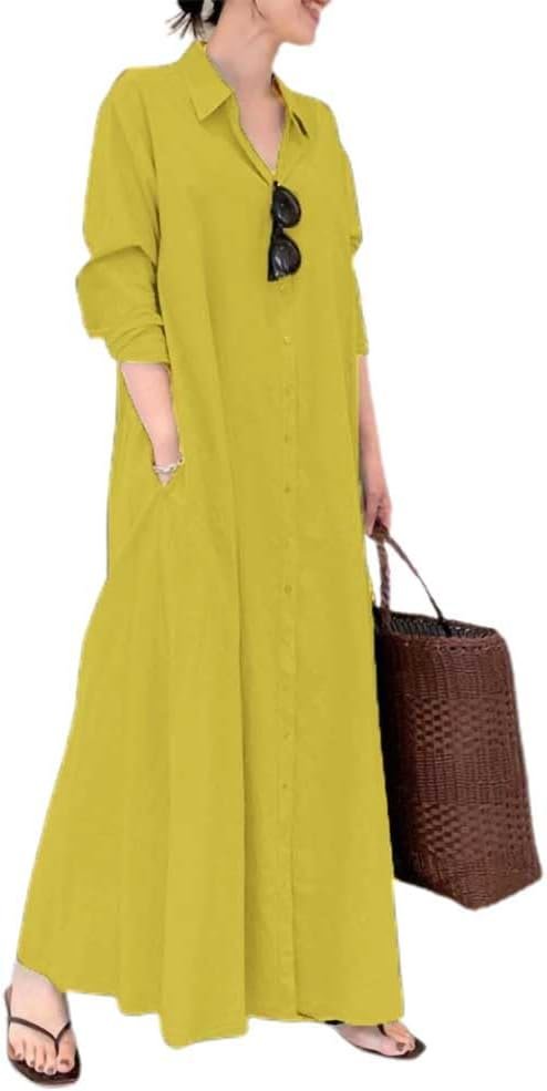 chouyatou Women’s Basic Loose Fit Long Sleeve Button Up Maxi Shirt Dress with Pockets