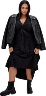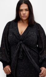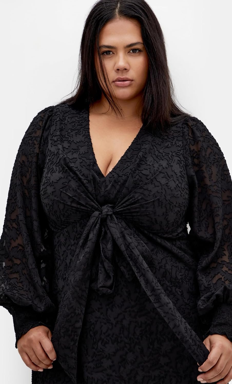 Make waves wherever you go with the stunning Marci Dress, a curve-loving design that is all about celebrating your unique style and confidence. This dress effortlessly combines glamour and versatility, giving you the freedom to flaunt it day or night. The deep V-neckline and chic tie-front bust detail highlight your silhouette while adding a playful, feminine edge. Whether you are owning the dance floor with friends or exploring new destinations, the Marci Dress is your go-to for unforgettable moments. Designed with a flattering shift-style silhouette and crafted from a raised self-print lined fabric, the Marci Dress is more than just a fabulous outfit, it is a statement. The pull-over style makes it easy to slip into, while the full-length sleeves with shirred cuffs add an elegant touch, blending comfort with sophistication. Pair it with bold gold accessories for a polished, glam look or keep it casual yet chic with a pair of trendy flats for daytime adventures. Confident. Bold. Effortlessly luxe. That is exactly how you will feel in the Marci Dress. It is not just about following trends, it is about setting them. Celebrate your body, your style, your moment. With the Marci Dress, you OWN it.