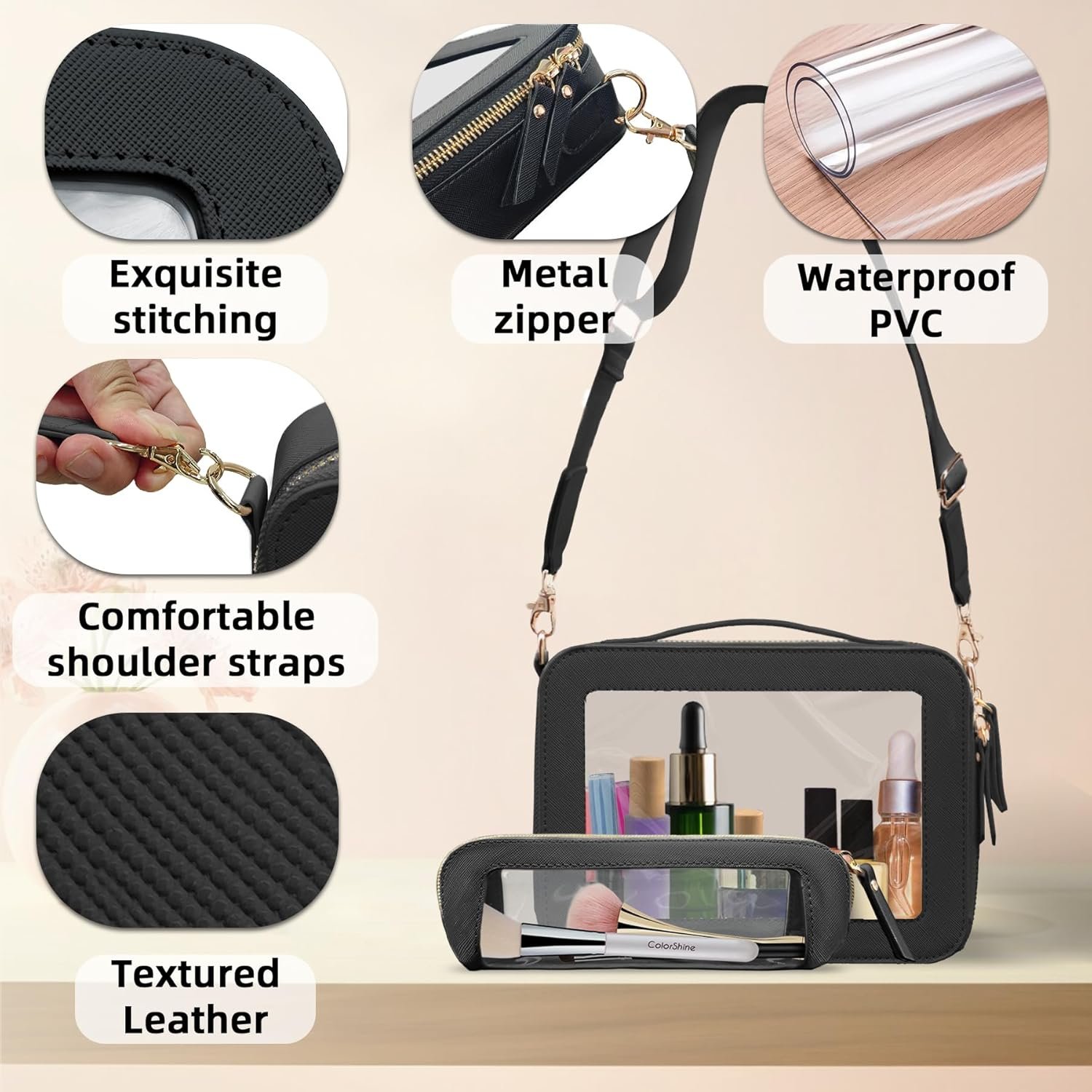 Clear Makeup Bag for Stadium Events, Cute Waterproof Travel Cosmetic Bag with a Separate Stylish Brush Pouch for Concerts, Premium Adjustable Shoulder Strap, Ideal for Airport or Concert Security Checks