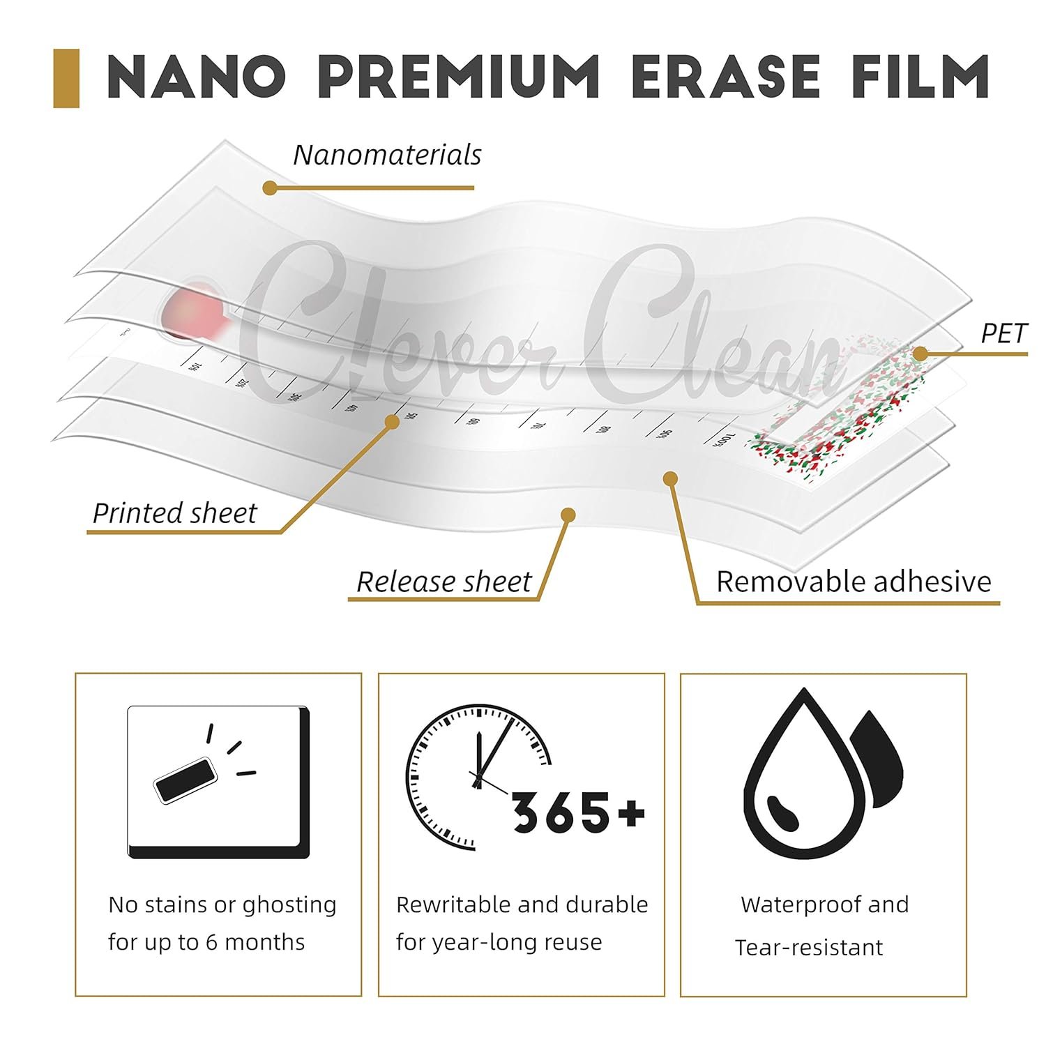 NEW TECHNOLOGY, NEW EXPERIENCE – Customer’s experience is very important to us, so we use the nano premium erase film on our products. Compared to the old PET film, the nano material will make your writings super easy to be wiped off even after you leave the writings on the goal sticker for a very long time. And it won’t leave any stains or ghosting. The nano film is also waterproof, so if you want to clean the sticker with a wet cloth. Just do it.