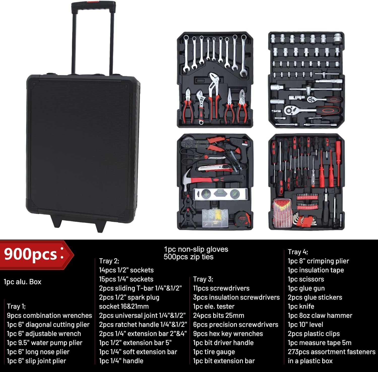 Complete Home Tool Set – 900pcs Versatile Rolling Tool Kit for Professional Repair and Maintenance – Heavy and Duty Portable Tool Box with Wheels