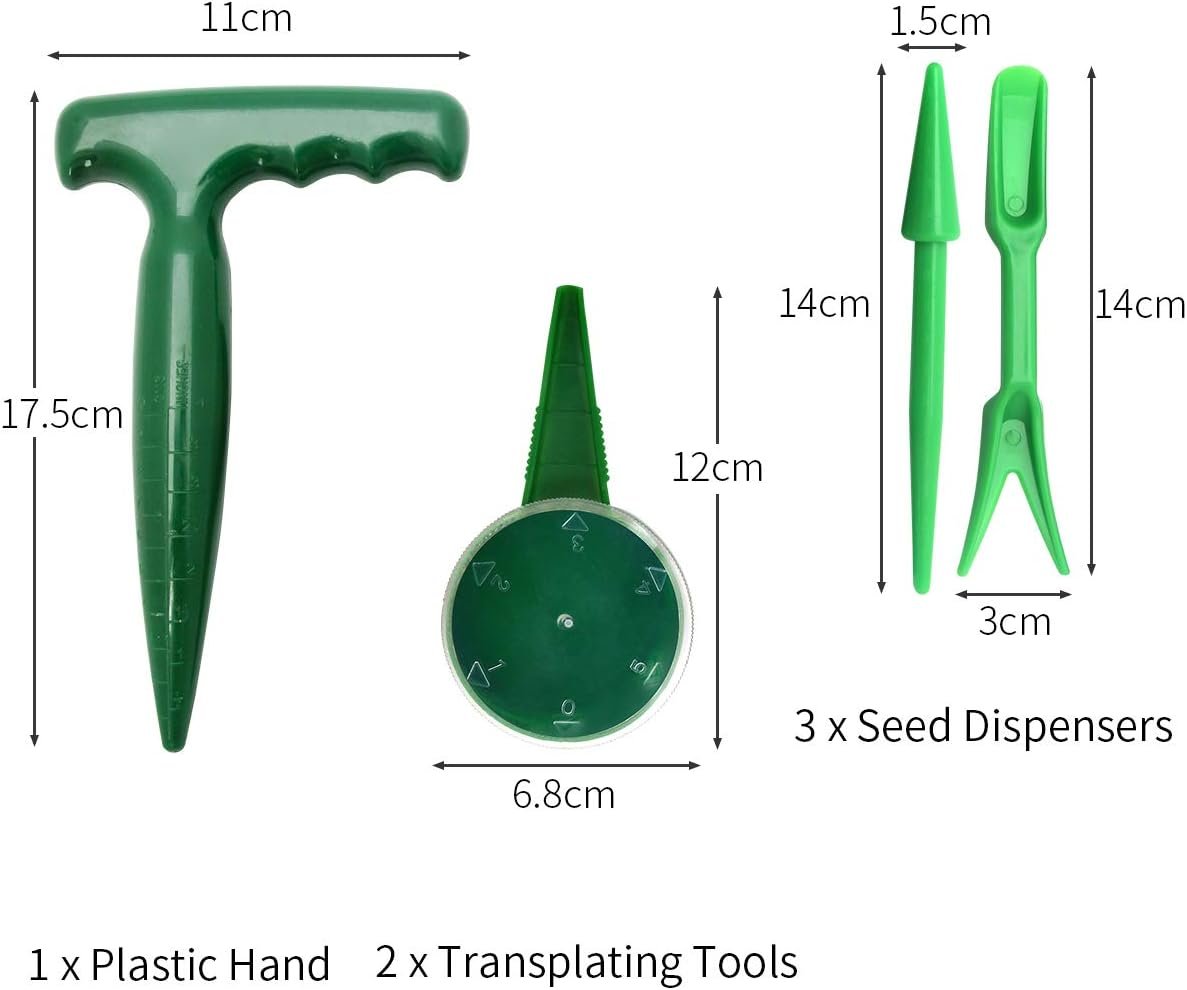 Set Of 6 – Pistol Grip Dibber Size: 17.5 x 11CM , Sowing Seeds Dispenser Size: 12 x 6.8CM, Seedlings Dibber And Widger Size: 14 x 3CM.