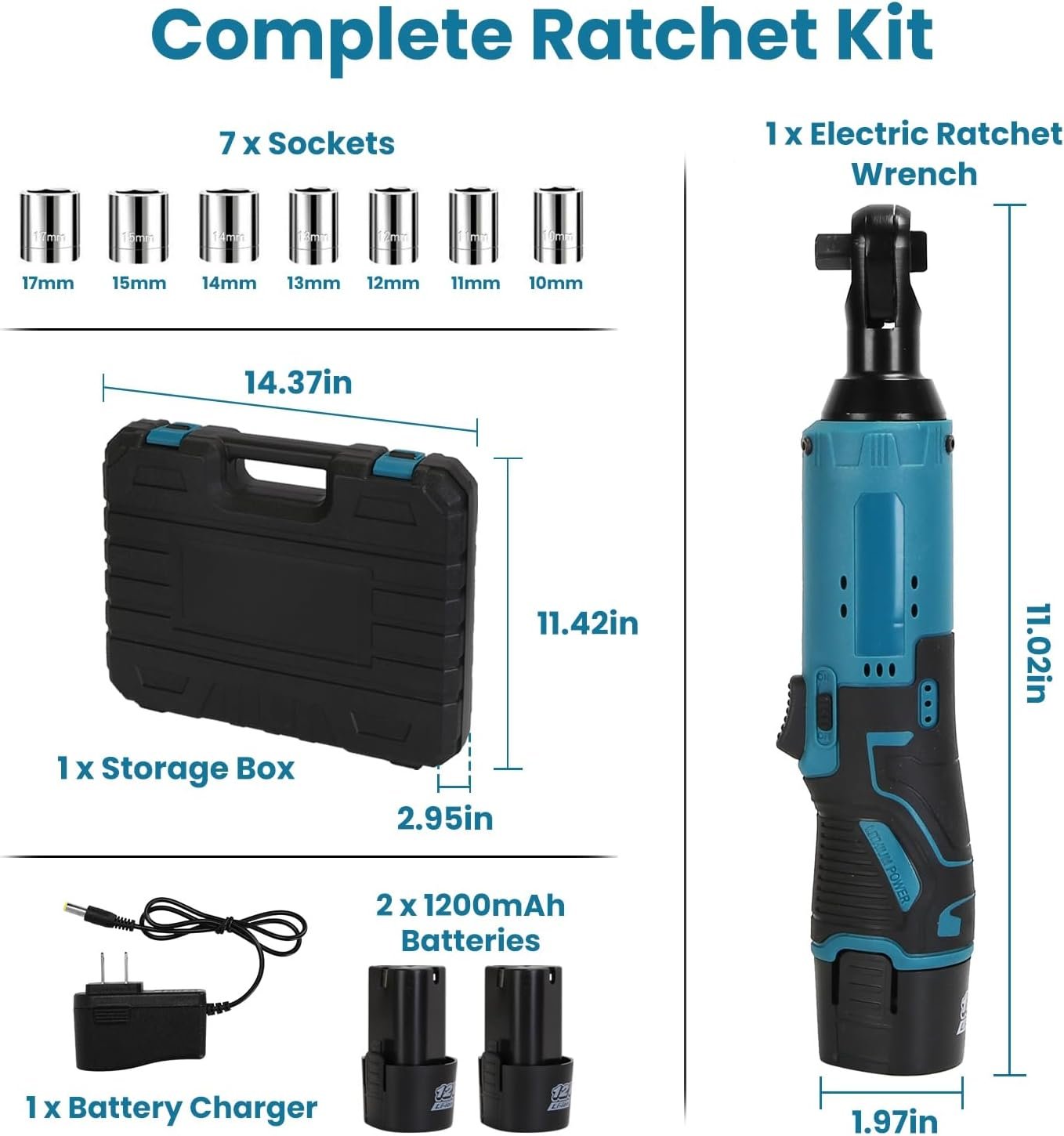 🔧 **COMPLETE & COMPREHENSIVE KIT**: This all-in-one ratchet wrench set includes everything you need: 1 cordless ratchet wrench, 7 durable sockets (10mm, 11mm, 12mm, 13mm, 14mm, 15mm, 17mm), 2 x 12V 1200mAh batteries, a charger, and a handy storage case to keep all your tools organized. Whether for home repairs or professional work, you’ll have the right tools at your fingertips.