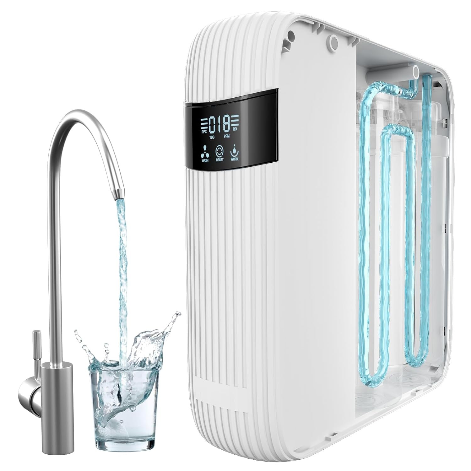 [User Friendly]: Tankless ro system under sink with integrated design minimizes leakage and noise. Easily monitor water safety with the real-time TDS with the TDS indicator readings displayed on the LED screen. The filter life indicator also alerts you when it’s time to replace the RO/PPC/C filter. Auto flush function prevents sediment accumulation, extending the filter’s lifespan and ensuring your water stays consistently pure.
