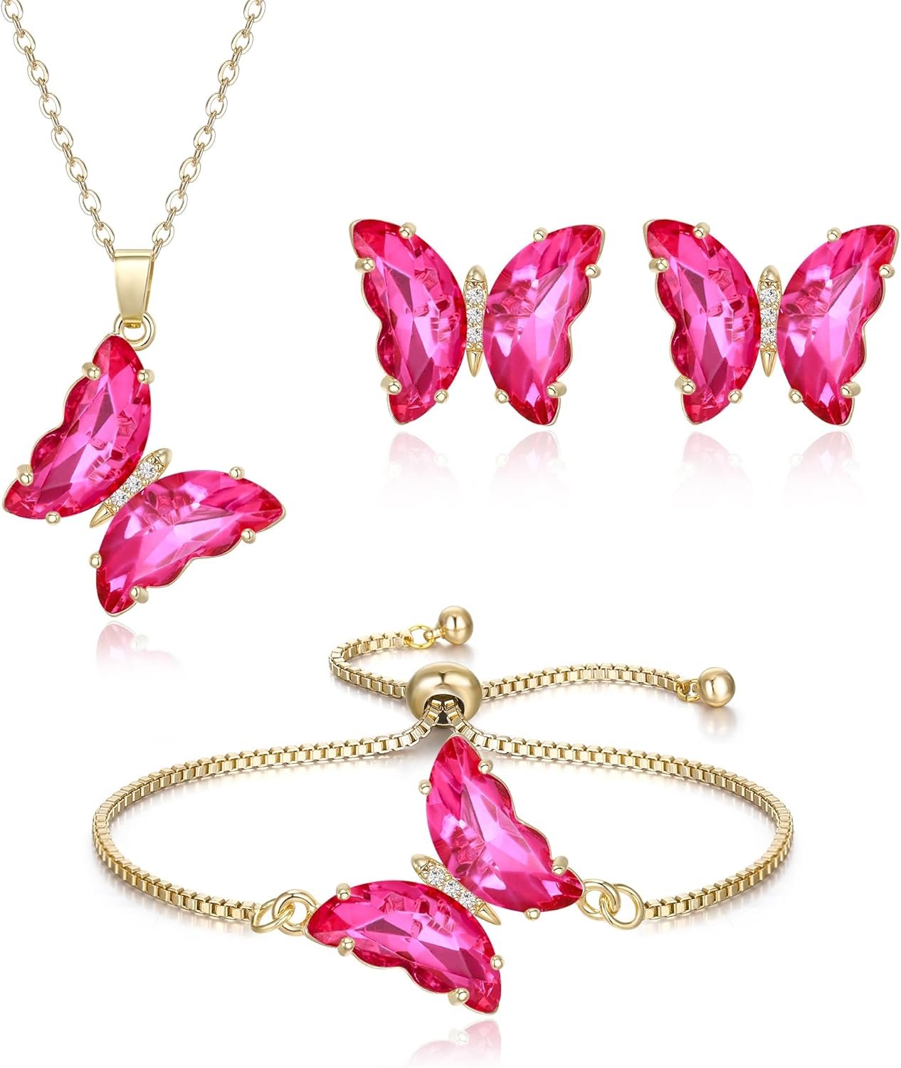 Crysdue Sparkling Cubic Zirconia Butterfly Necklace Stud Earrings Adjustable Slider Bracelet Jewelry Set, Birthday/Valentines/Mothers Day/Christmas Jewellery Gift for Women