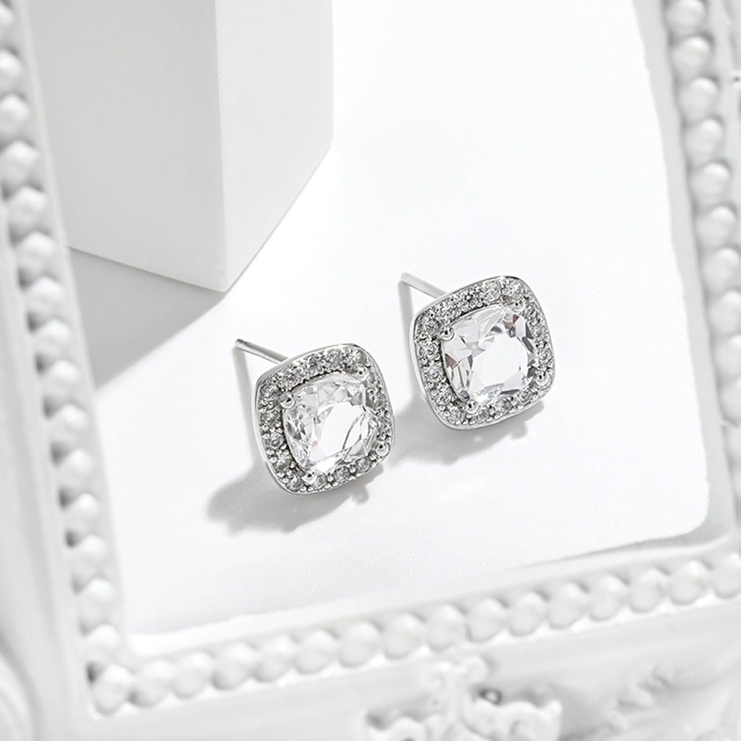Cubic Zirconia Earrings and Necklace Set for Women 14K White Gold Plated Square Jewelry Set for Women Silver Pendant Necklace Hypoallergenic Stud Earrings Set Jewellery Gift