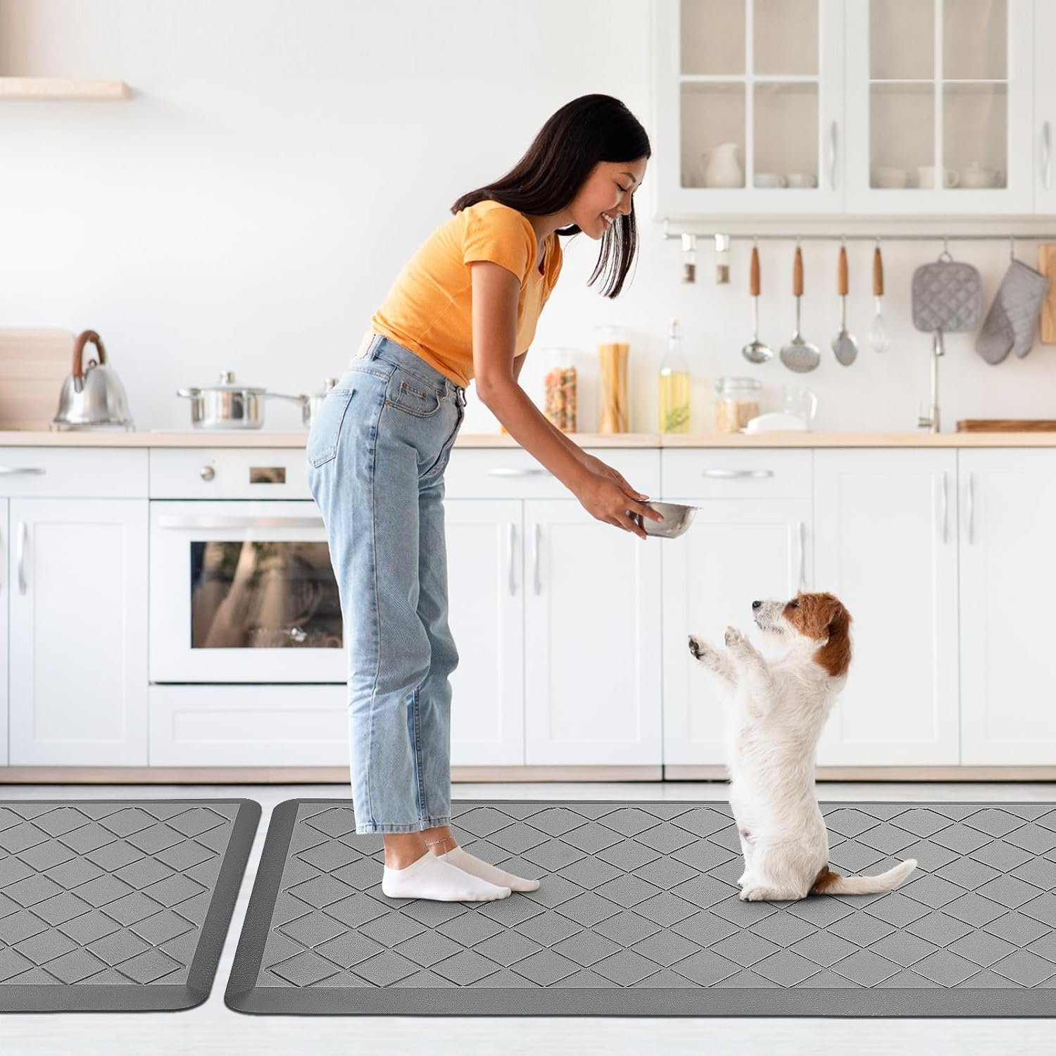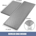 VERSATILITY: The kitchen anti fatigue mats are measured as 17.3×29 inches and 17.3×47 inches in dimension. The floor mat set provides extra large area for standing in laundry room, kitchen, office, in front of the sink or other indoor space. The premium material is built for long-lasting durability.