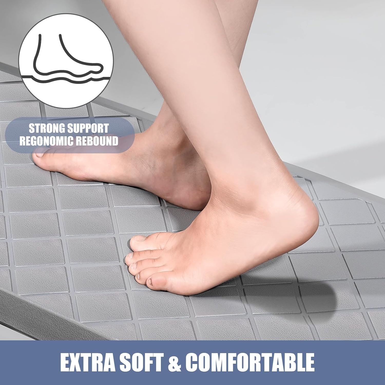ANTI-FATIGUE: The anti-fatigue kitchen rug is ergonomically engineered to relieve pressure. Extral thick mat provides perfect support and comfort and cushioned foam can improve circulation and standing posture while working. The cushioned floor mat core is made of 0.5 inches/12mm foam that is soft and comfortable when you step on it.