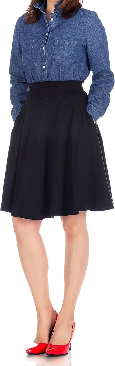 Dani’s Choice High-Waisted Cotton Blend Skirt with Pockets – Knee Length A-line Flare for Business and Casual Wear