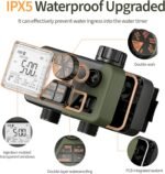 IPX5 Waterproof: The garden hose timer has IPX5 level waterproof, no problem for daily use. And the battery compartment has a built-in sealing strip to effectively prevent water from entering, which gives the water timer a long service life.The screen, buttons, and internal sealed compartment are designed to prevent water ingress even when submerged up to 15cm for 24 hours