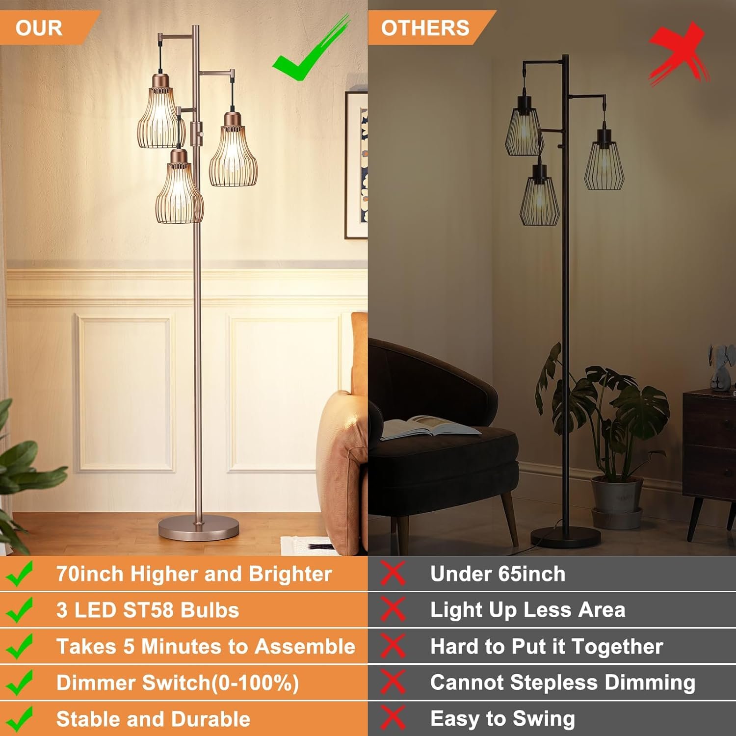 【2025 UPGRADED FLOOR LAMPS】- The tall 3-cage brown floor lamp blends farmhouse and vintage styles to perfectly match any décor in your home.In March, we upgraded our materials to include high-quality LED bulbs and professionally certified all-metal bodies. Our floor lamps are more stable and durable, eliminating problems such as sudden shut-offs and unstable installations. Enjoy superior quality and make life easier and more comfortable.