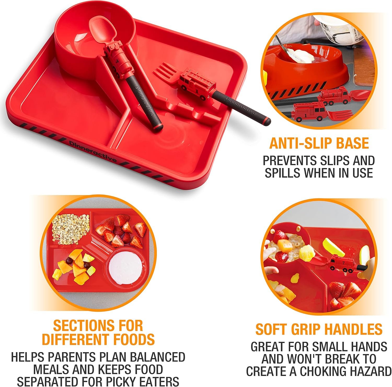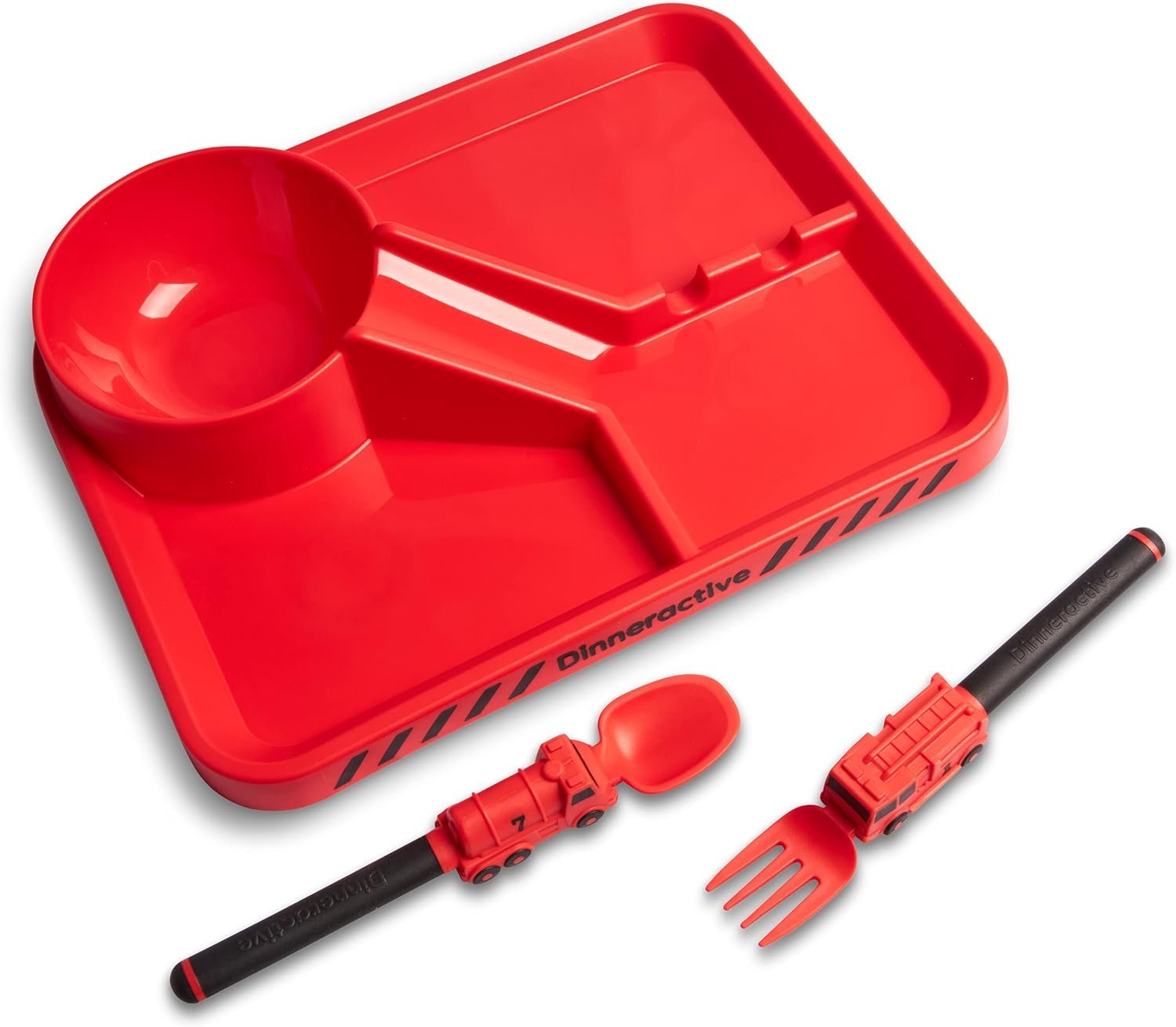 Dinneractive Dining Set For Kids – 3PC Red Firefighter Dinnerware – Fire Truck Utensils – Toddler Plates – Baby Dishes