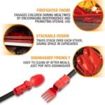 The bright red firefighter layout and fun fire truck-like utensils make dinnertime fun for kids, while encouraging their mealtime independence and the development of utensil skills. It will also help create a positive association with healthy foods.