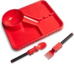 This bright red firefighter-themed dinnerware set combines practical child development with engaging entertainment that kids will love. It features three pieces: a large plate, a “fire truck” fork and “tanker truck” spoon. The plate is divided into four sections, three plate areas and one bowl. There is a ramp leading up to the bowl so the child can load food from the lower area into the bowl for eating! It’s a great way to inspire kids’ imagination while encouraging mealtime independence and utensil skills. It also helps parents plan balanced meals with each area on the plate representing a food group. Plus the divided areas keeps food separated, which is helpful to picky eaters. The utensils are bendable and so won’t break into dangerous pieces. The plate is equipped with a non-slip base to prevent spills and messes. And they go right into the dishwasher for easy cleanup. They are made of BPA-free plastics. And they are stackable so they take up less space in the cupboard!