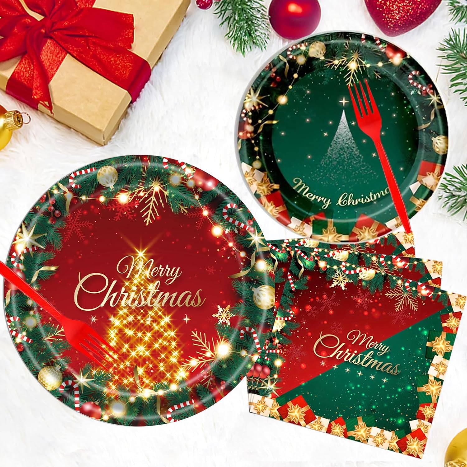 Christmas Party Supplies Serves 24: This Christmas party supplies set including 24 plates (9inch), 24 plates (7inch), 24 napkins (6.5inch) and 24 Forks, Serves 24 guests, the sufficient quantity to meet your party use and replacement needs.