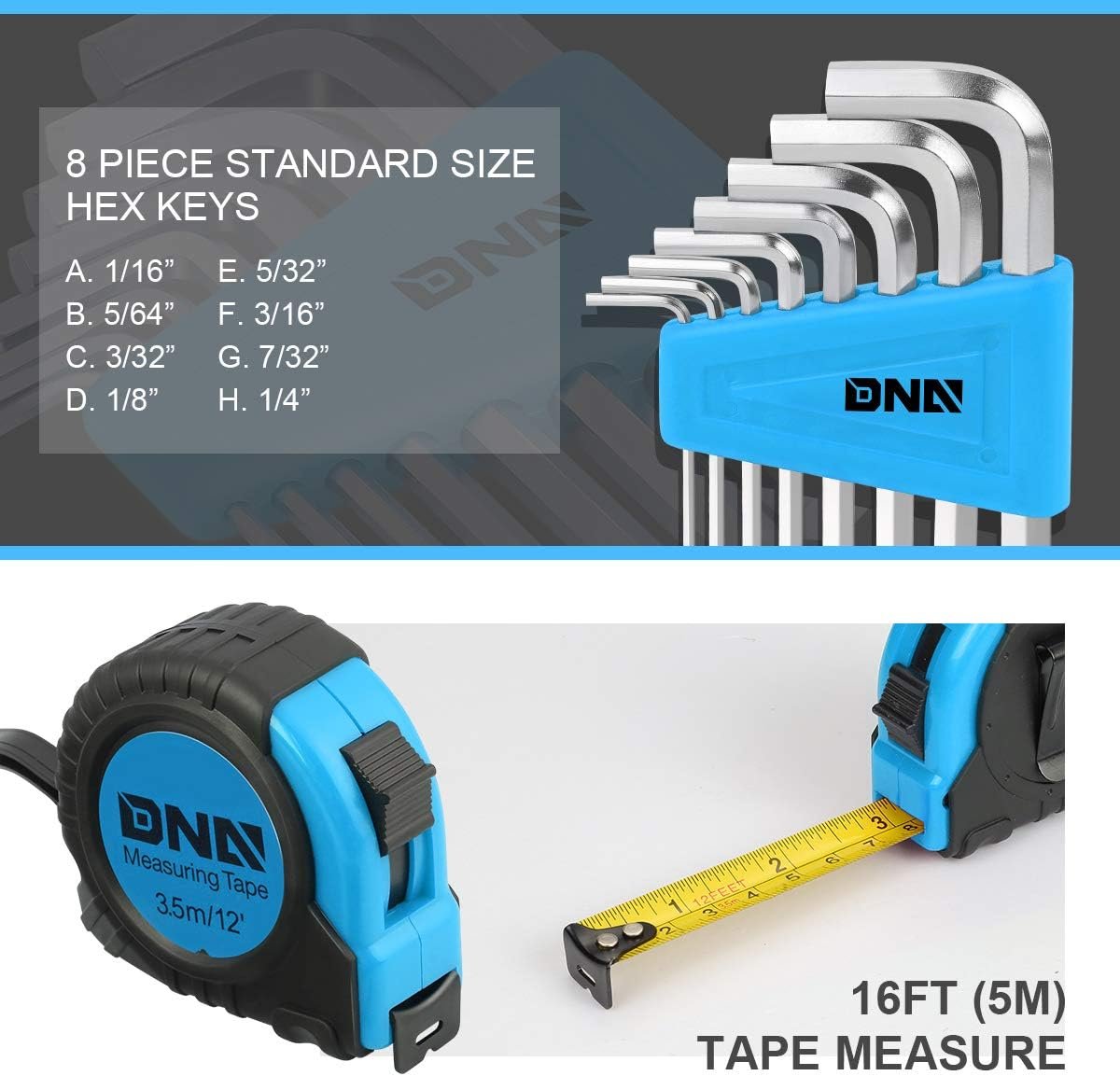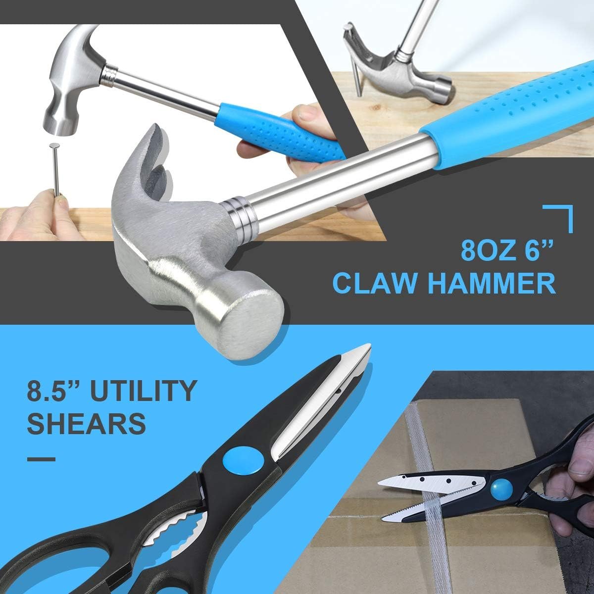 INCLUDES – (8) hex keys: 1/16″, 5/64″, 3/32″, 1/8″, 5/32″, 3/16″, 7/32″, 1/4″; (20) screwdriver bits; (1) bit driver; (1) magnetic bit holder; (4) precision screwdrivers; (1) utility knife; (1) 8oz 6″ claw hammer; (1) 16ft (5M) tape measure; (1) 8.5″ utility shears; (1) 6″ slip joint plier