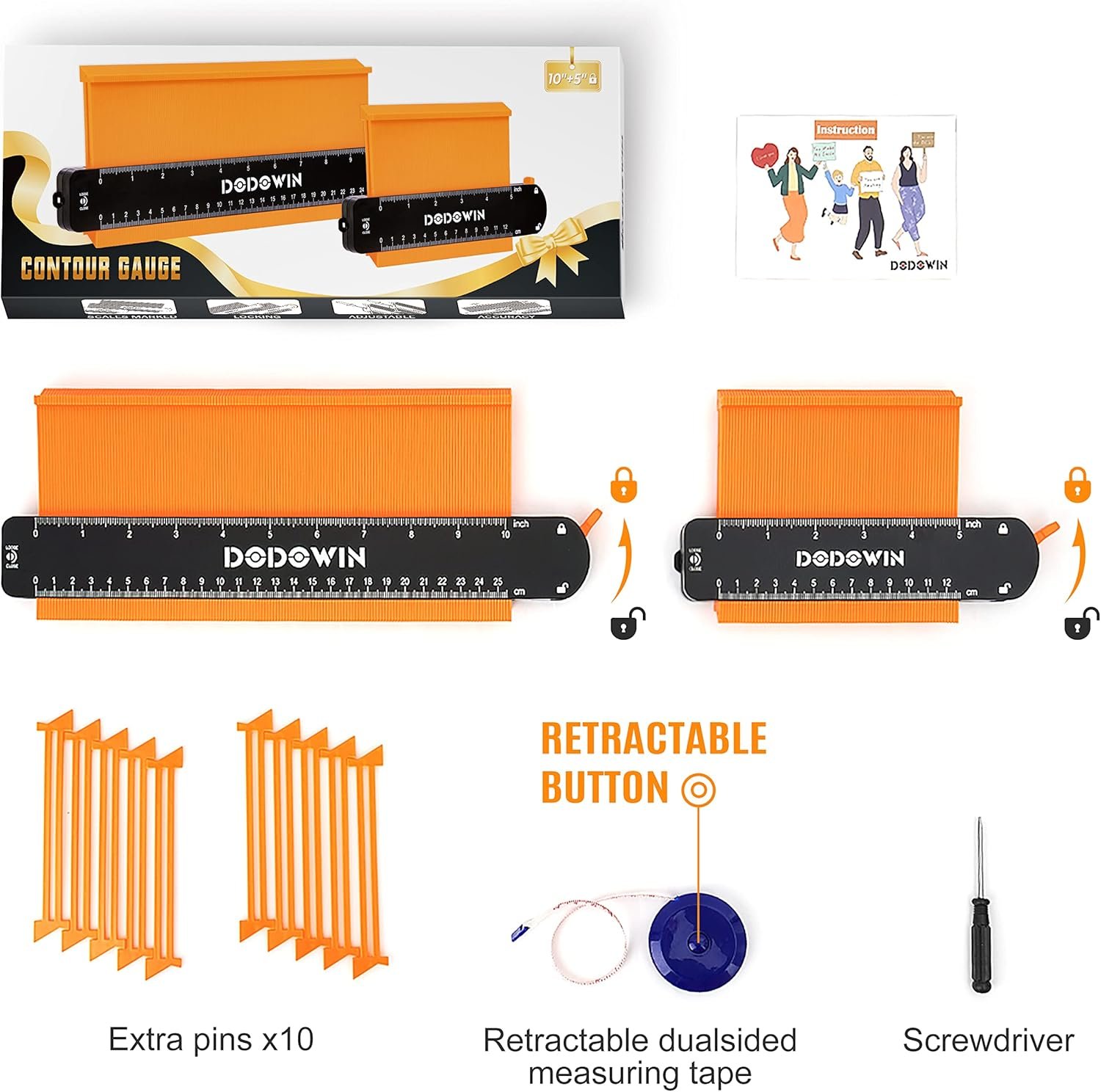 【Contour Gauge Tool】Package included: 1 × 5” deepen contour gauge duplicator, 1 × 10” deepen contour gauge and 2 × freegift-retractable dual sided measuring tape, screwdriver. Contour gauge with lock can keep the shape unchanged, measuring and copying a profile accurately for winding pipes, woodworking, circular frames,car bodies, carpentry and for all kinds of modelling etc.