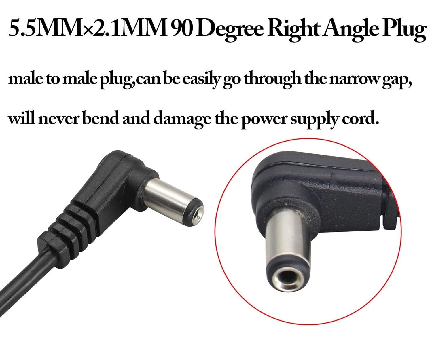 “[Double elbow design]:L-Shape 5.5mm x 2.5mm male to male DC adapter power supply cable, 90 degree right angle male to male 90 degree right angle plug power cord. The 5.5 x 2.5mm 90 degree right angle plug jack power cable can be easily go through the narrow gap, will never bend and damage the power supply cord.