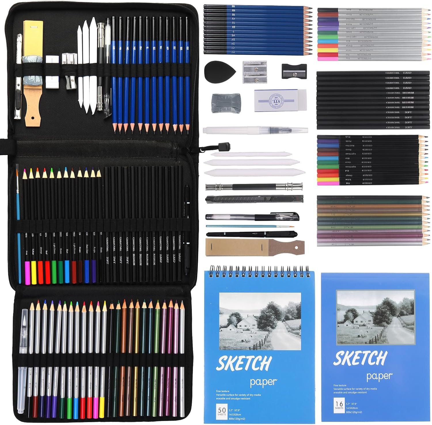 【All-in-one Professional Drawing Sketching Kits】: 78 Pack Art Pencil Set include 12 sketch pencil, 12 metallic coloured pencils, 12 water-based coloured pencil, 12 oil-based coloured pencil, 12 charcoal pencil, 12 sandpaper board, 1 pencil extender, 3 paper eraser, 1 art kinfe, 1 felt-tip pen, 1 white charcoal, 1 graphite pen, 1 vinyl erasers, 1 kneaded erasers, 1 water brush pen, 1 brush pen, 1 single hole pencil sharpener, 1 double hole sharpener, 1 marker, 2 sketchbook, 1 canvas storage bag, 2 sketchbooks, Perfect for drawing, sketching, shading, layering, blending, and more