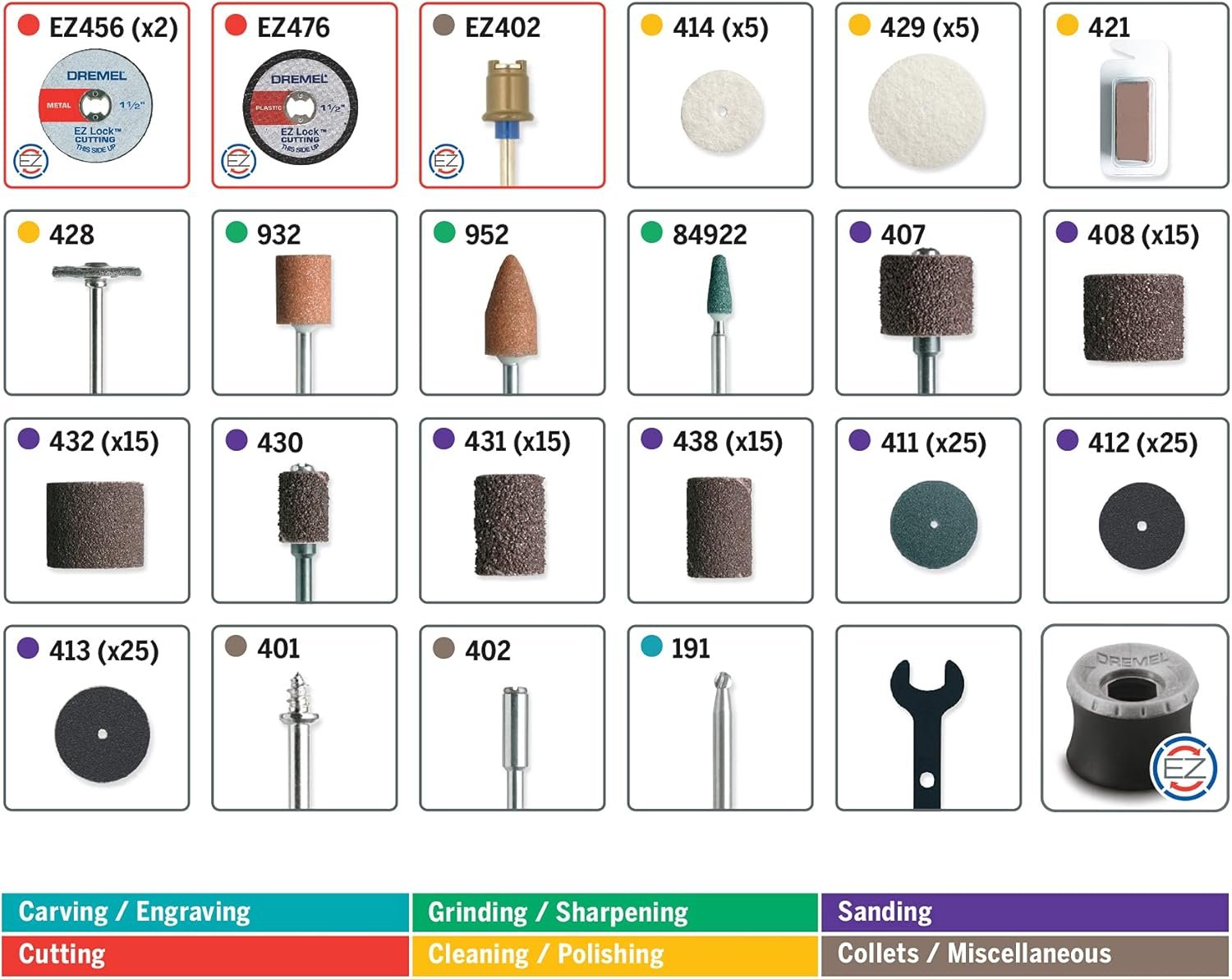 EZ LOCK TECHNOLOGY: Accessory set includes a variety of EZ Lock rotary accessories including the EZ Twist nose cap wrench, EZ Lock mandrel, and EZ Lock cut-off wheels. The patented Dremel EZ Lock system makes accessory changes 6X faster than using a standard mandrel.