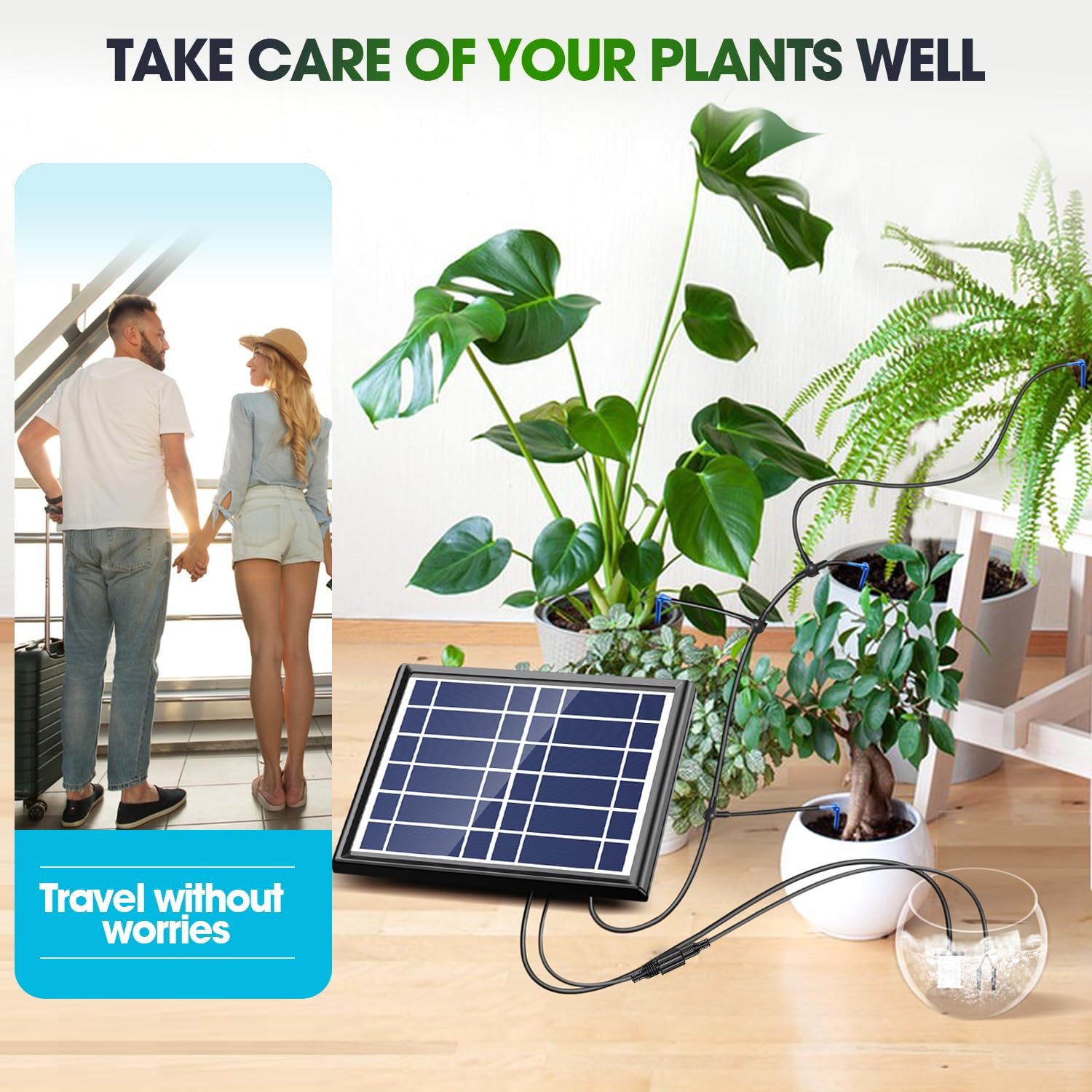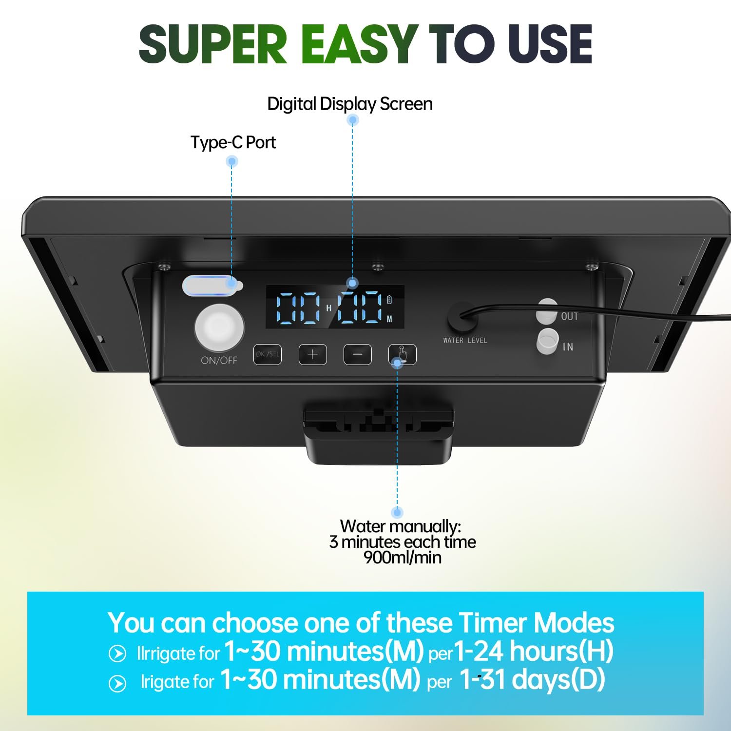 Plant Nanny-inspired Watering System:This irrigation system for garden is solar powered, and has the most power on the days water is needed most. It has large capacity with 3000 mAh and still functions after a few overcast days. 15-20 days duration after full charged. Effortlessly nurture thriving plants at home or away, and enjoy a lush green oasis. Your gardening made easier and more delightful with this caring companion. Just prepare a big container of water, then go for a happy long vacation