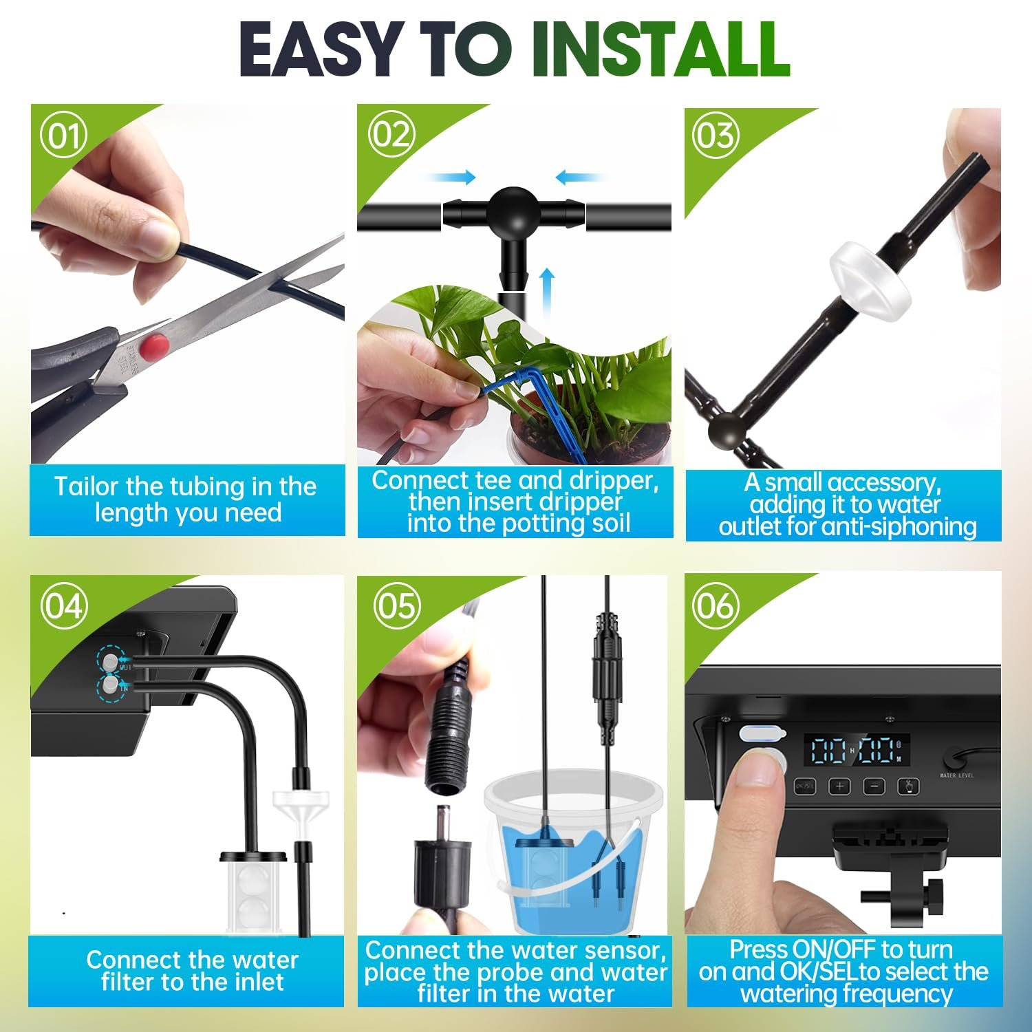 Irrigation System For Indoor And Outdoor Application: The drip irrigation kit is equipped with IP54 waterproof and sunlight resistance durable material, making it perfect for both indoor and outdoor using. Fix the product in a position that can put the solar panel under the sunshine directly and the side with the switch button must be faced down. You can insert the solar panel into the soil by using the ground stake, or fix the solar panel with screws on the wall, fence, etc as your needs