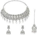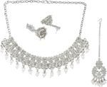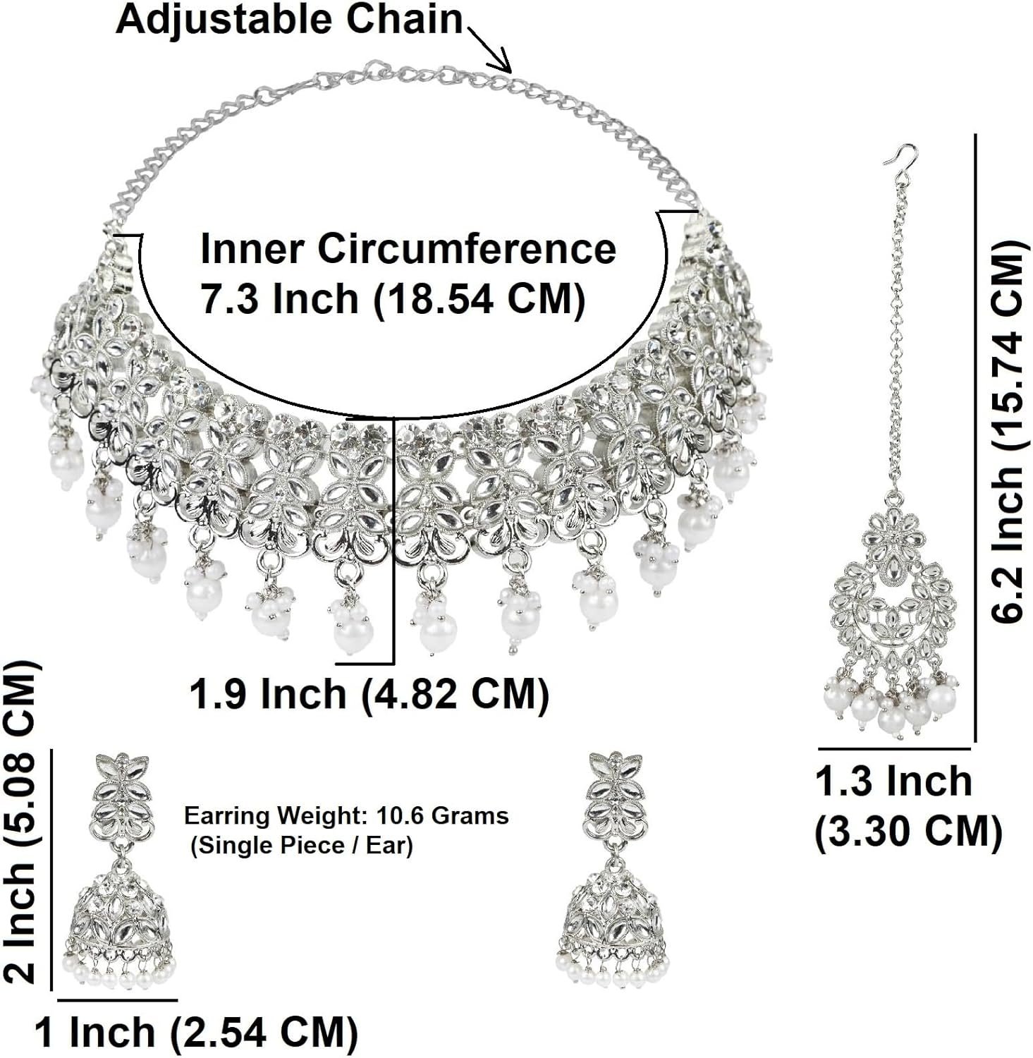 Indian faux kundan jewelry set, crystal choker necklace bridal jewelry set, this antique traditional, boho, ethnic statement choker Indian jewelry set, choker necklace chandbali earrings maangtikka bridal jewelry set costume accessories for women and brides adds a traditional touch to your ensembles. Embellished with kundan stones, faux pearls and rhinestone, crystal, a classic fusion of exquisite craftsmanship and feminine elegance. This antique look jewelry goes with everything in your closet from ethnic outfit like saree, lehenga, gowns, suits on any wedding, party, engagement, ring ceremony, anniversary or any festive or special occasion or as fashion novelty costume jewelry. Ideal Valentine’s,Anniversary, mother’s day, women’s day. CARE INSTRUCTIONS: Avoid contact with heat, chemicals and water. Clean with dry cotton cloth. Pack in an air tight container/ pouch after use. It is advisable to wear the jewellery after makeup.