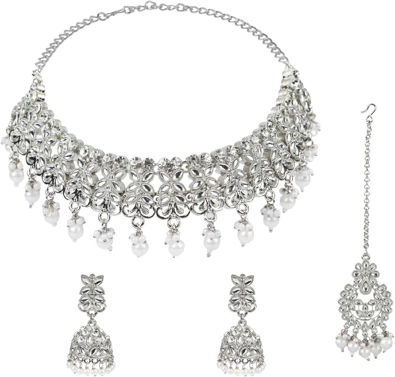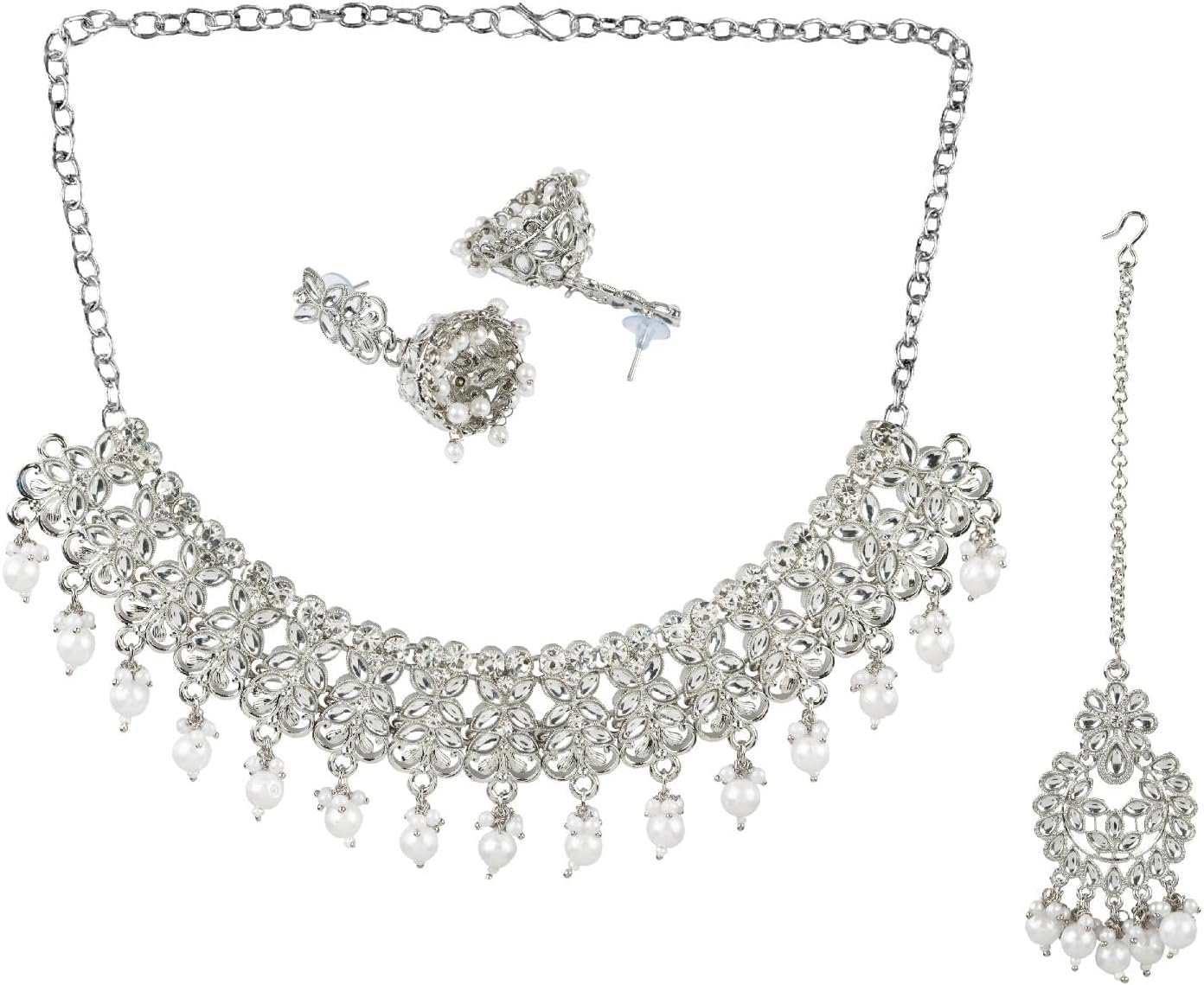 Efulgenz Crystal Choker Indian Jewelry Set Faux Kundan Pearl Crystal Stone Necklace Dangle Earrings Maang Tikka Head Chain Bollywood Wedding Bridal Jewelry for Women