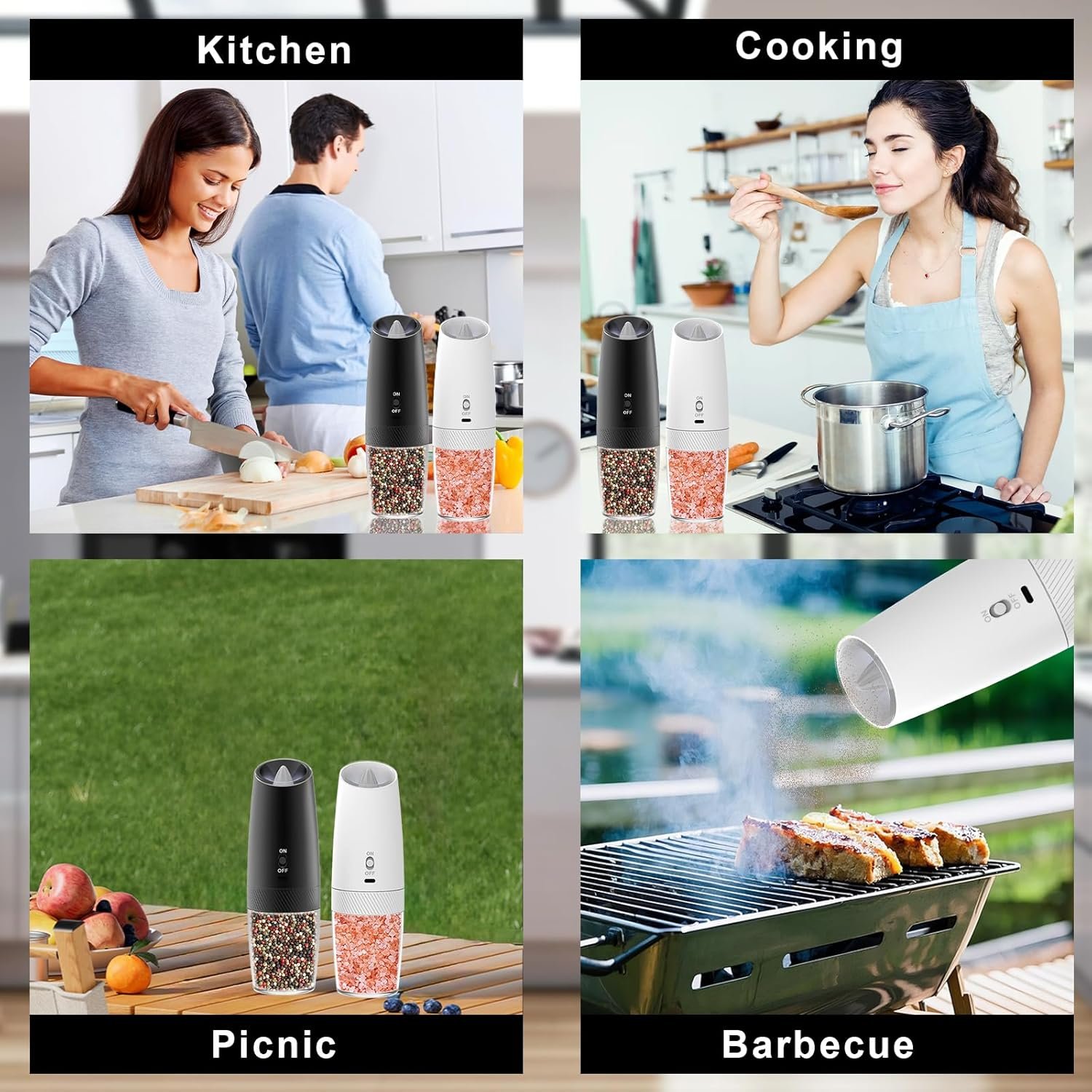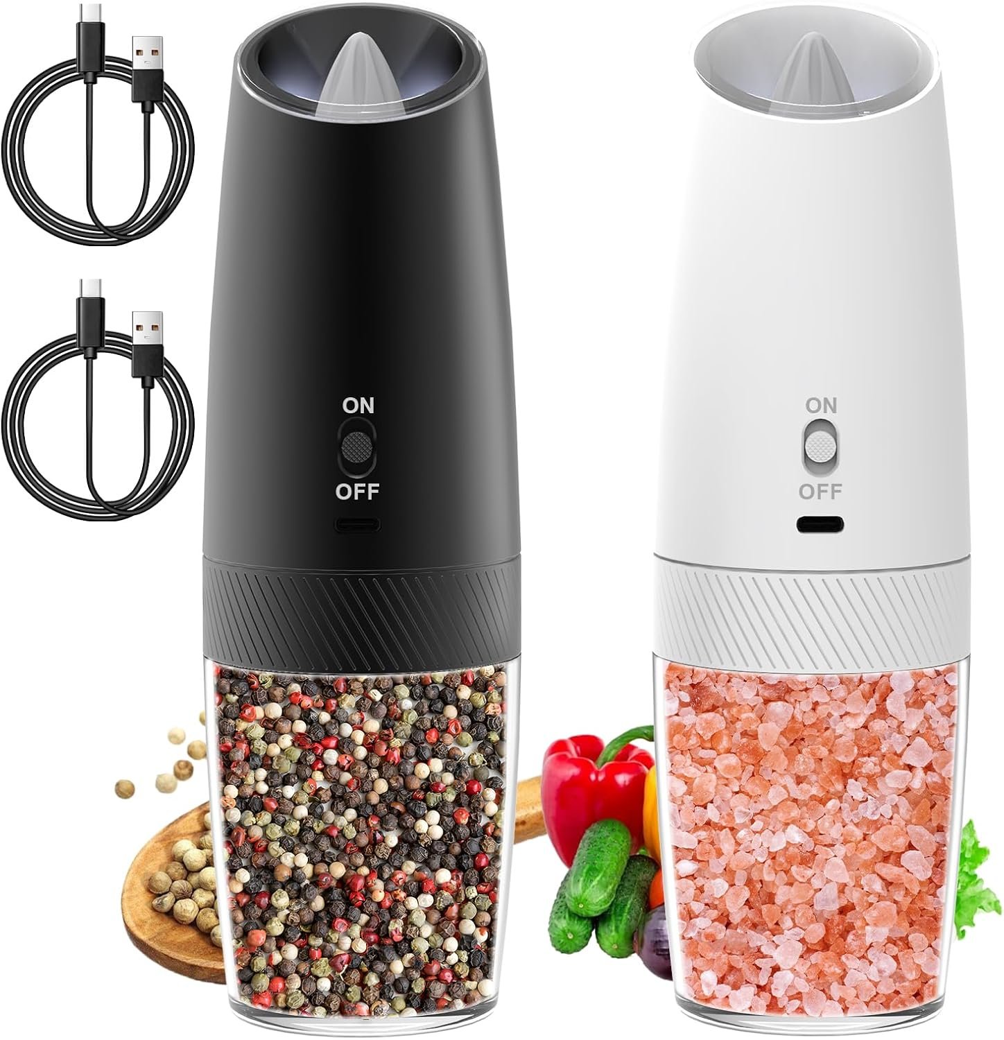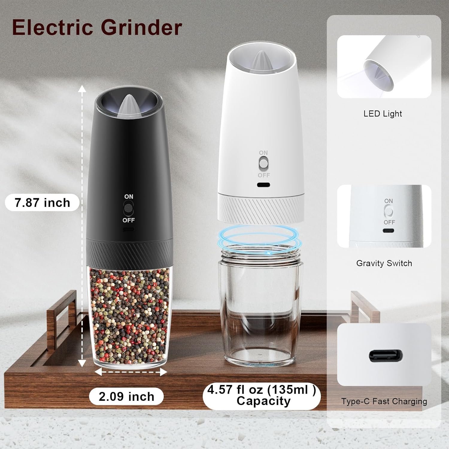 Electric Salt and Pepper Grinder Set Rechargeable Gravity Pepper and Salt Mill Grinder Set Type-C Fast Charging, Adjustable Coarseness, Large Capacity with LED Light (Black White-2pcs)