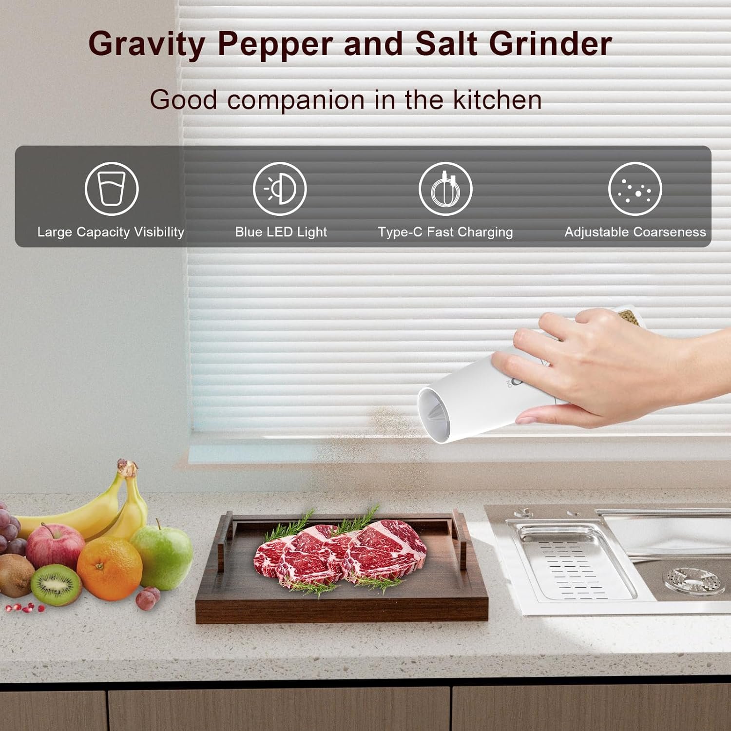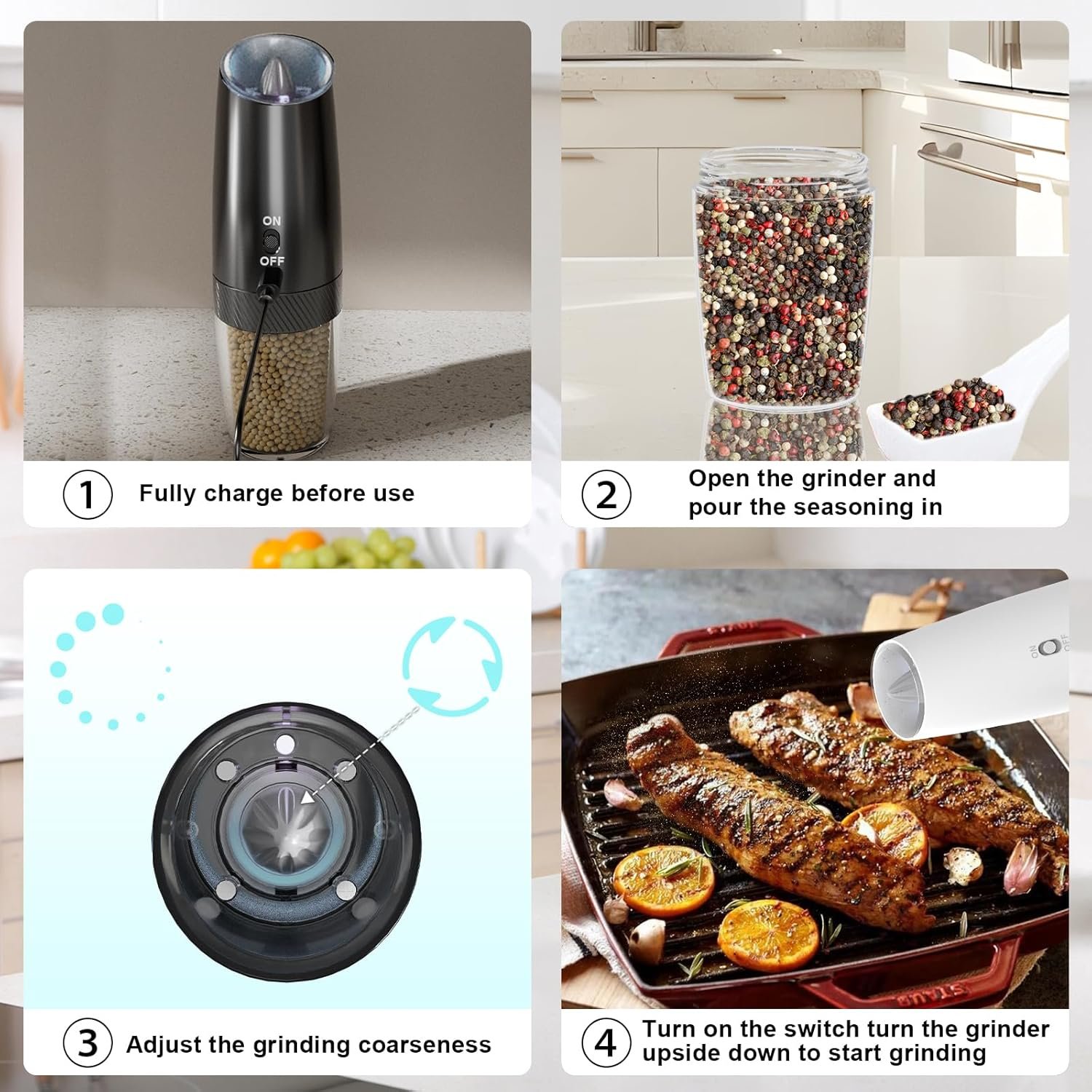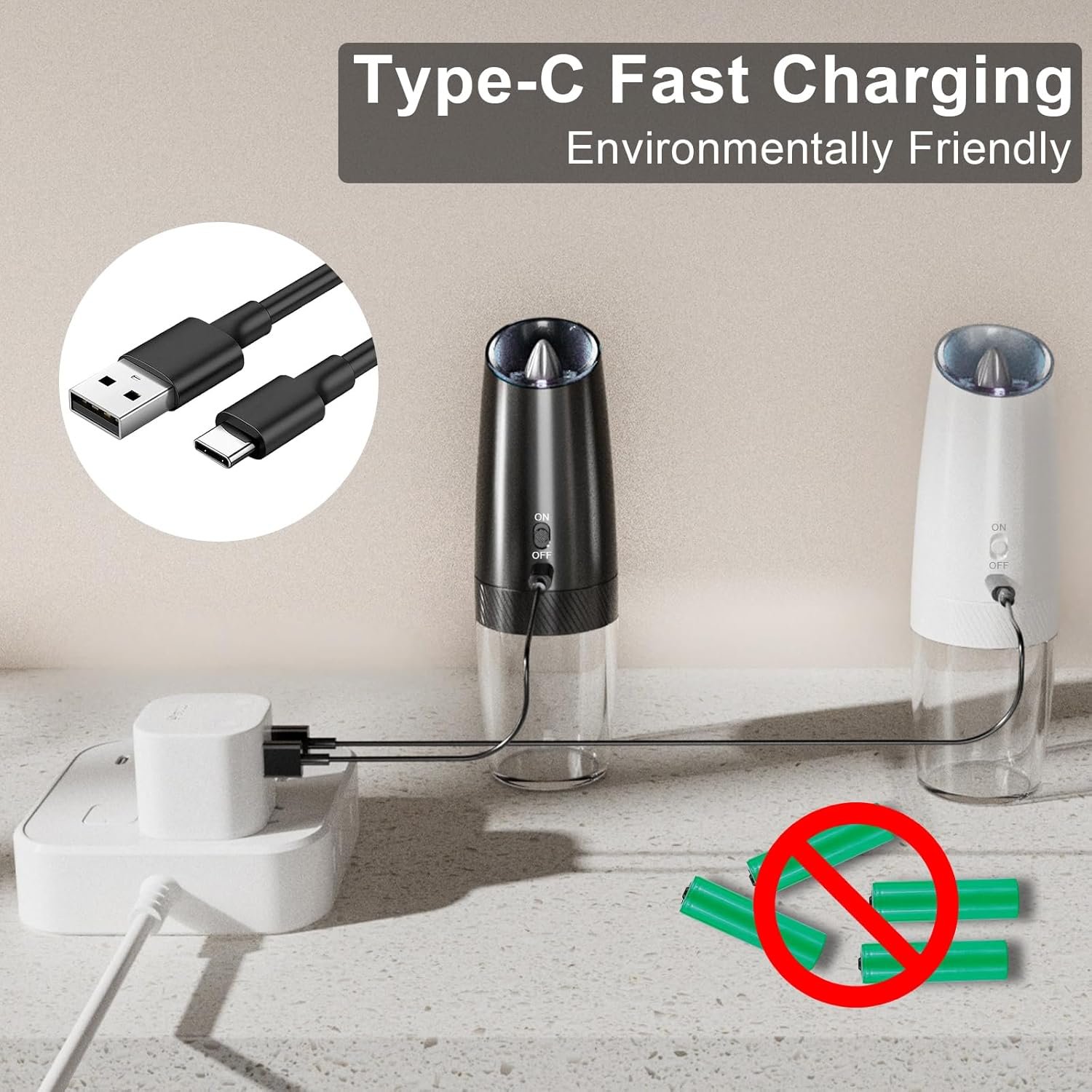 FAST CHARGE: The rechargeable salt and pepper grinder set comes with a c-type charging cable for quick and easy charging. A single charge lasts up to a month of daily use, eliminating the hassle of frequent battery changes and making it the perfect electric salt and pepper grinder for busy kitchens