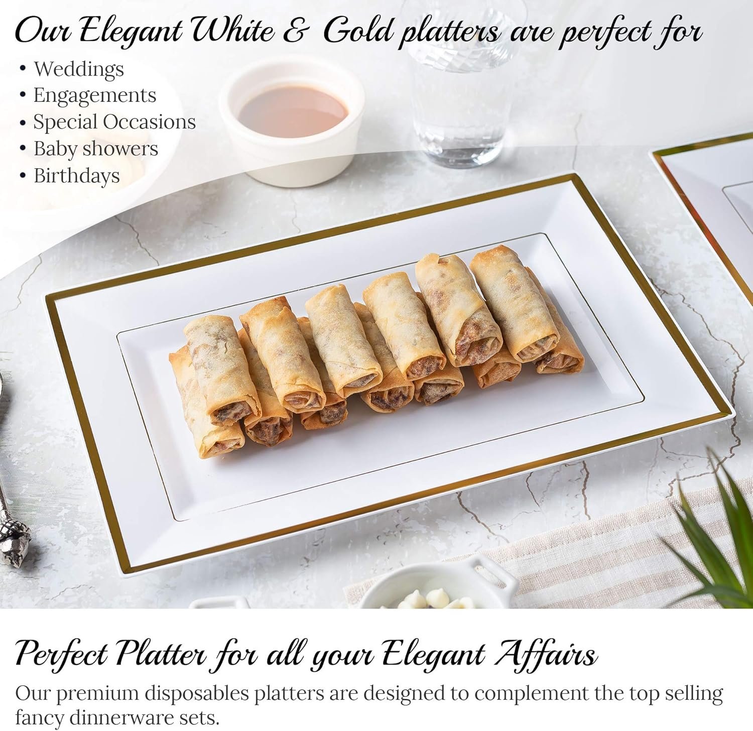 COMPLIMENTS YOUR FANCY PLASTIC DINNERWARE SET – Our plastic trays perfectly match the top selling disposable silverware sets, so you can add an elegant white and gold serving tray to your plates, bowls, glasses or cutlery. Goodbye traditional old white serving trays that make your food look dull and unappetizing!