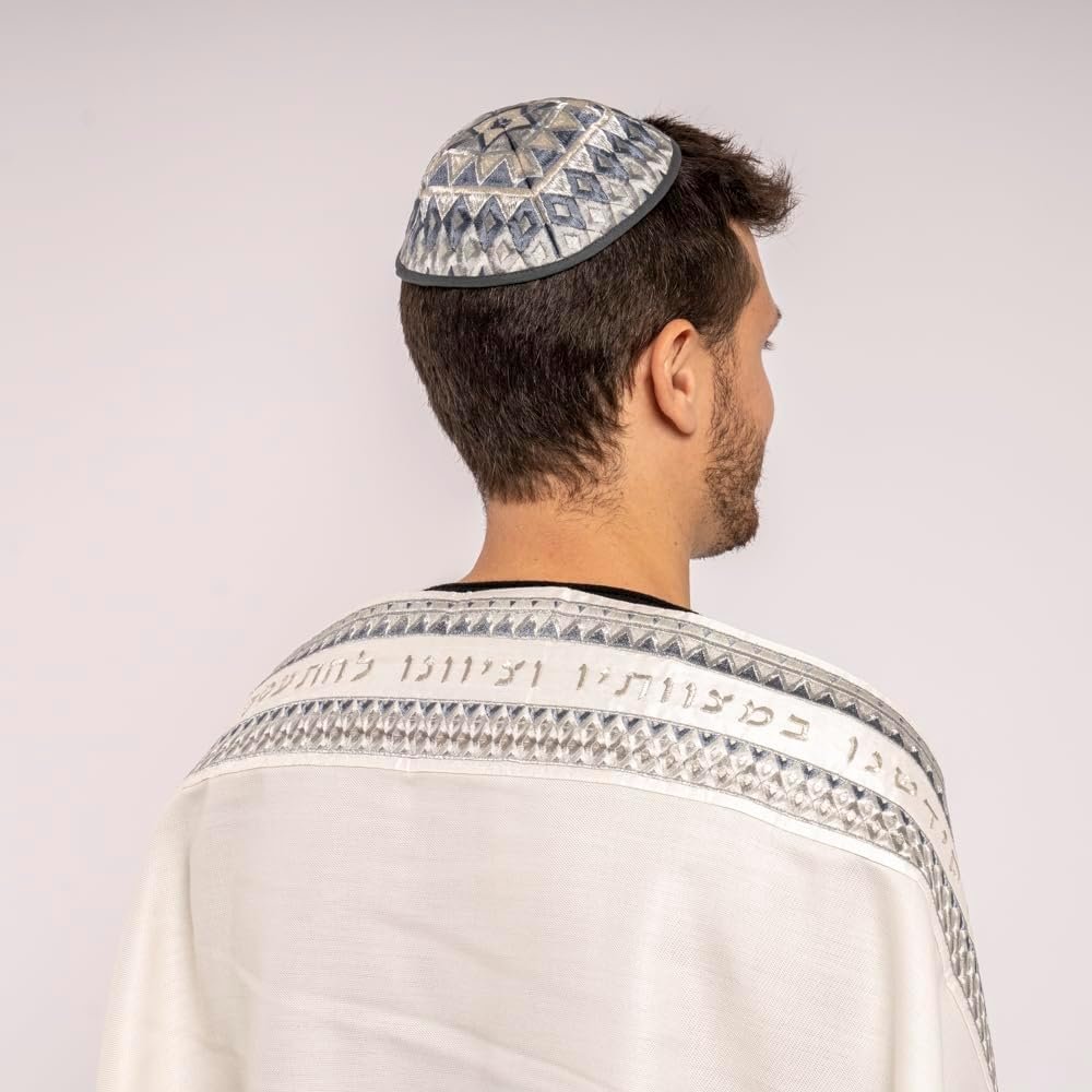 EMANUEL Yair Tallit Prayer Shawl Set with Yarmulke and Tallis Bag | Silk Embroidered Geometric Square Design