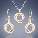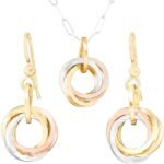 Perfect for everyday wear, this tri color earring and pendant set should be a core piece of every woman’s wardrobe. Offering a sophisticated look that goes with everything, the square edge on each interlocking ring gives these knots a distinctly modern feel. Handcrafted Argentium (the low tarnish sterling silver) with both 14K Yellow and Rose Gold Fill links are individually woven together, making earrings and pendants that are not only striking, but fun to fidget with as well. They make a great gift idea as well, appealing to any woman who likes minimalist or classic design in her jewelry.