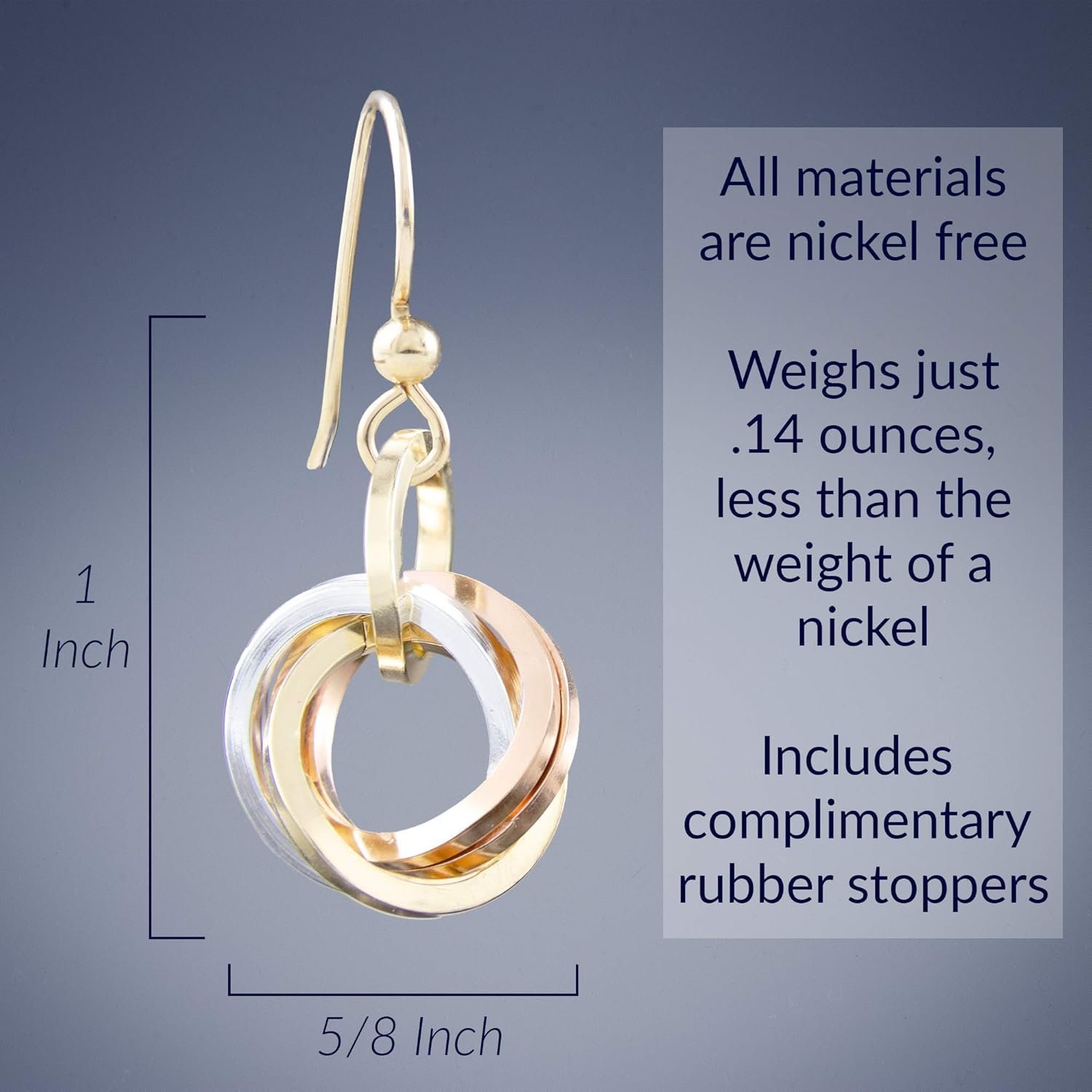 Earring Weight: just .14 of an ounce each – less than the weight of a nickel (.17 oz).