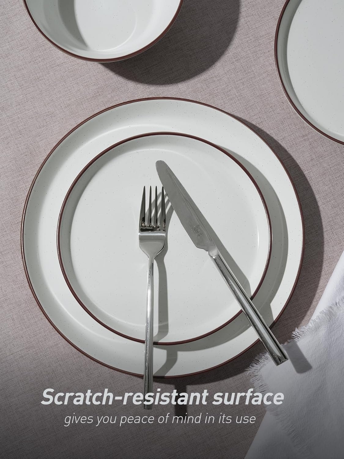 [Sturdy & Scratch-Resistant]: The glaze of our plate and bowl set is fired at 2340℉ for 13.5 hours to form a strong scratch resistant surface. No need to worry about scratches from your forks or knives