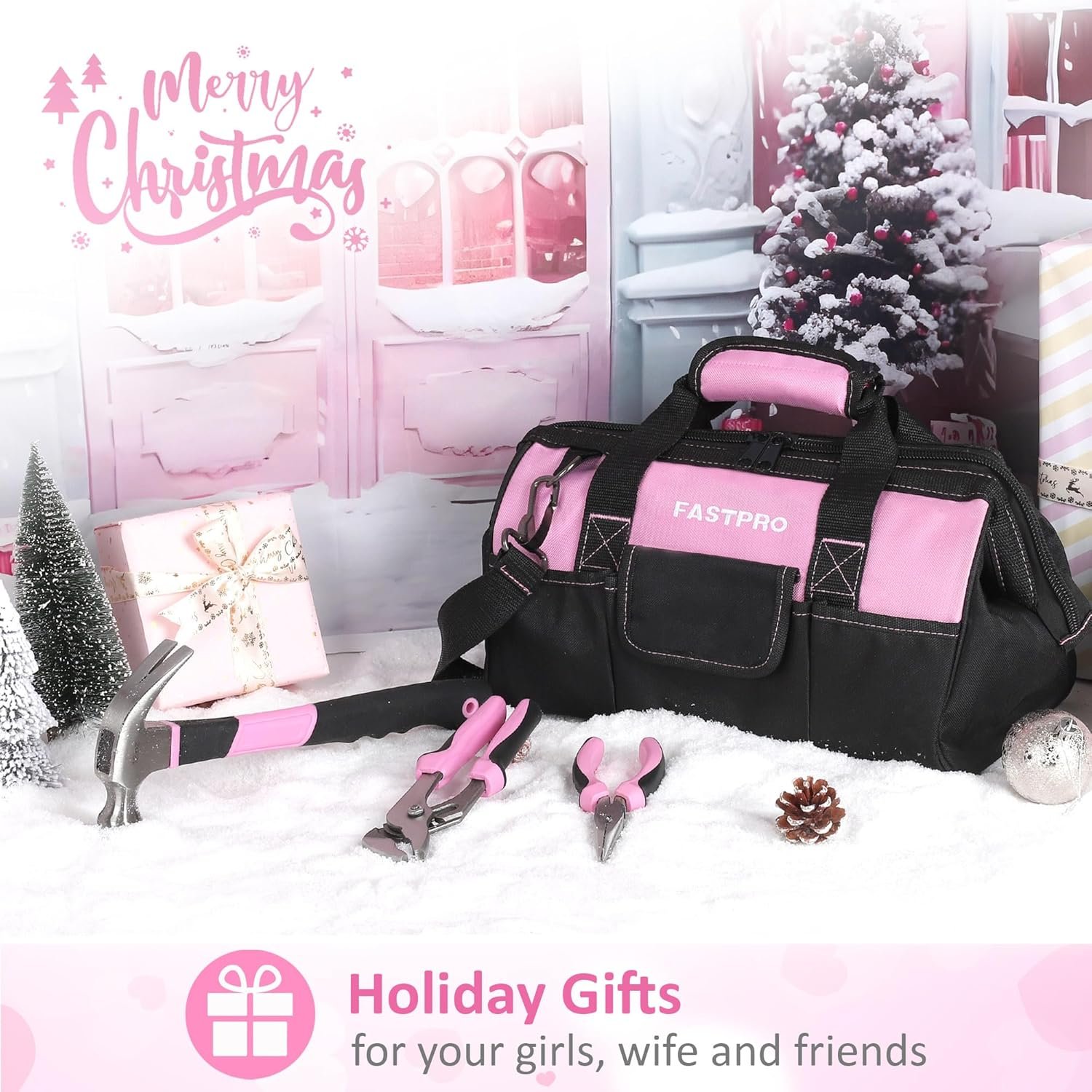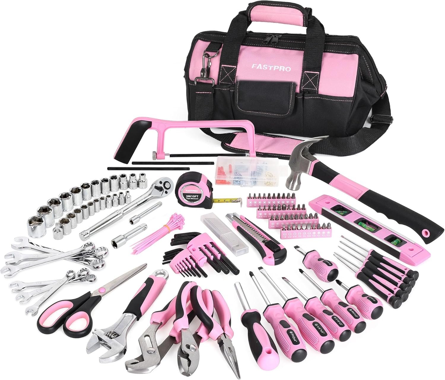 FASTPRO 267-Piece Pink Tool Set, Home Repairing Tool Kit with 13-Inch Wide Mouth Open Tool Bag, Mechanics Hand Tool Kit for DIY, Home Maintenance