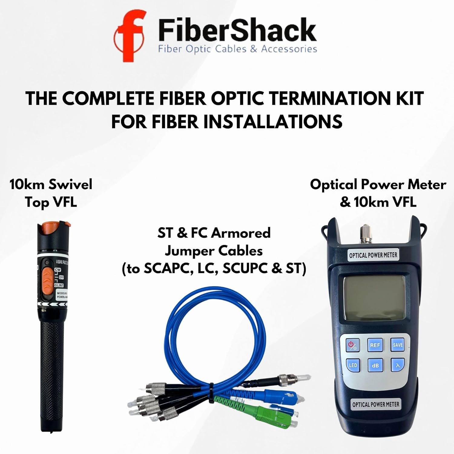 QUALITY METERS – Fiber Optic Kit contains an Aluminium 10km VFL with Swivel head top to maintain strong readings. -70~+10 dBm Optical Fiber Power Meter & FC/SC Adapters with 10km VFL. ST/FC Armored Jumpers & Couplers to find fiber faults quickly