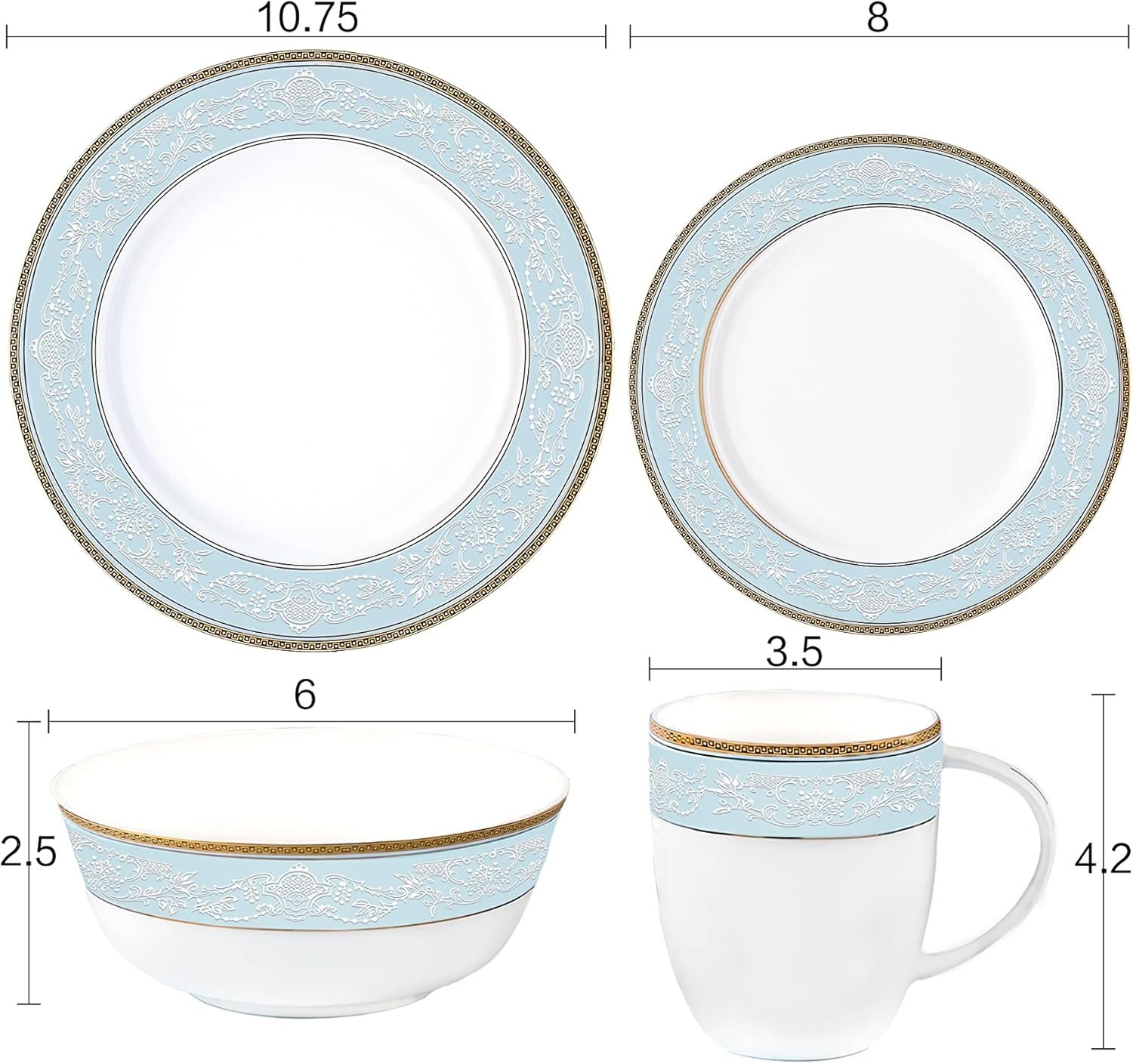Fine Bone China Dinnerware Set,16 Pcs Classic Relief Pattern Gilt Edged High Grade Porcelain Tableware Sets For 4 People