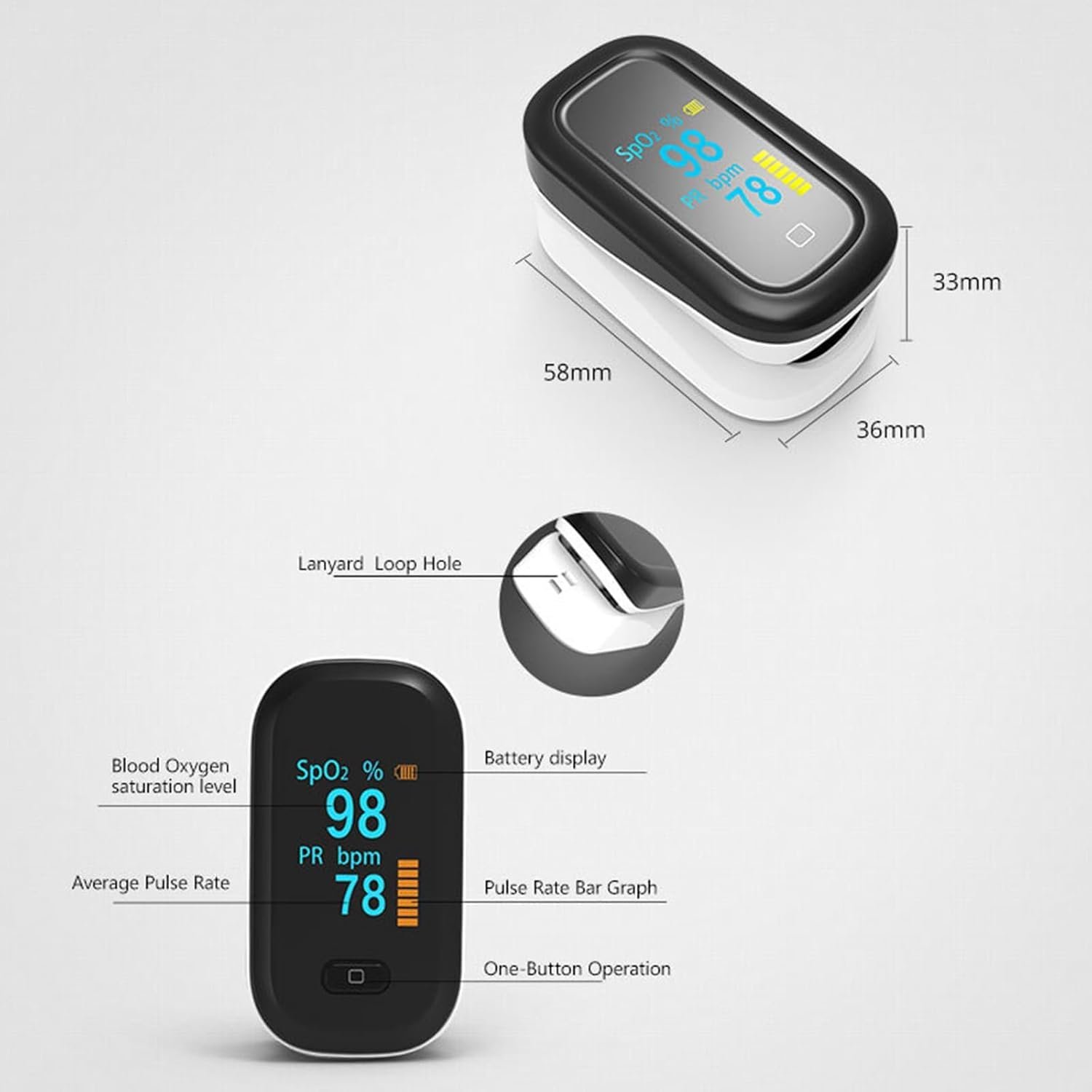 【LARGER & BRIGHTER SCREEN】The oxygen saturation monitor features a 1.3″ OLED display with a protective cover that is larger than other 0.9″ screens, ensuring clear visibility for the elderly. Large digital LED display.