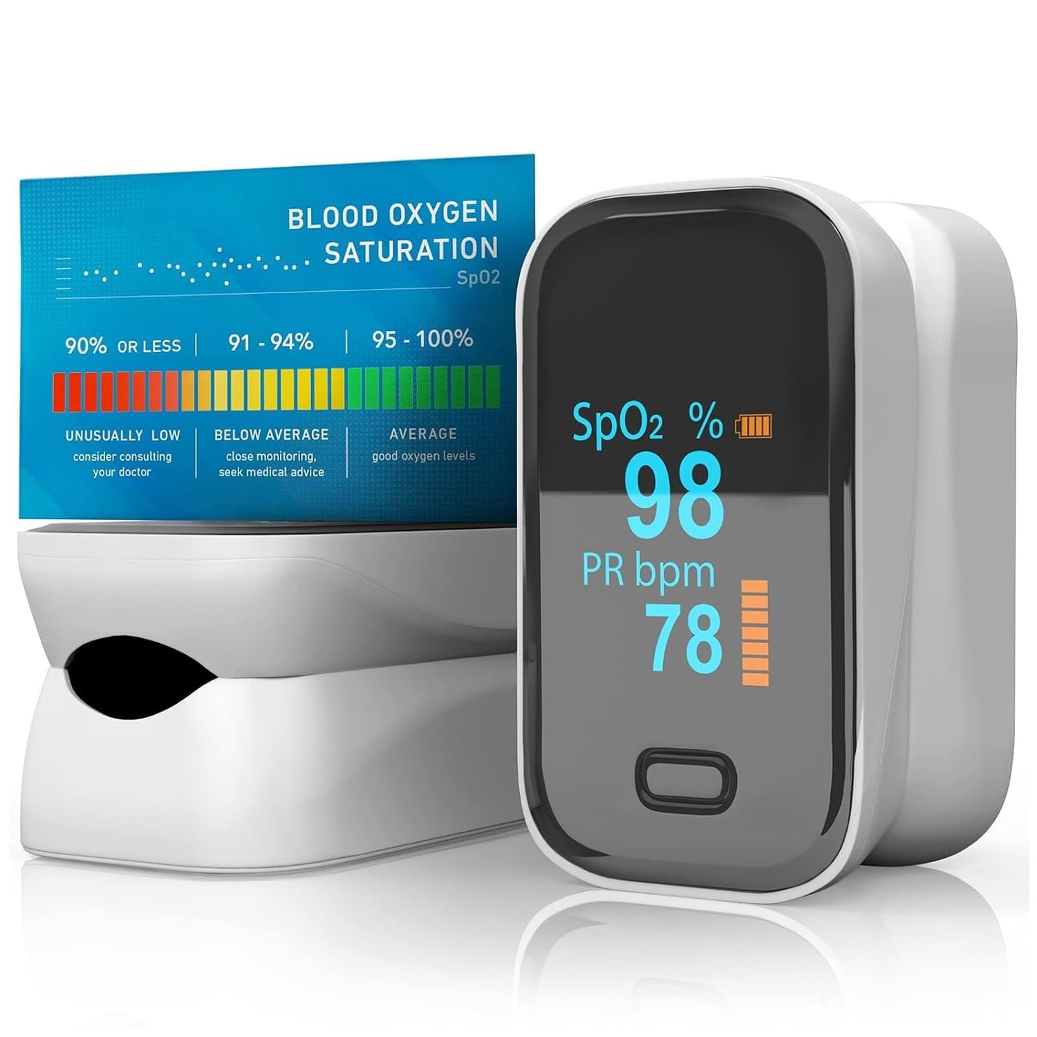 【ACCURATE & FASTER】Pulse oximeter fingertip utilizes advanced intelligent chips to ensure faster detection speed. The Oximeter determine your SpO2 heart rate and heart strengthin 8s and display it conveniently on a large digital OLED display accurately.