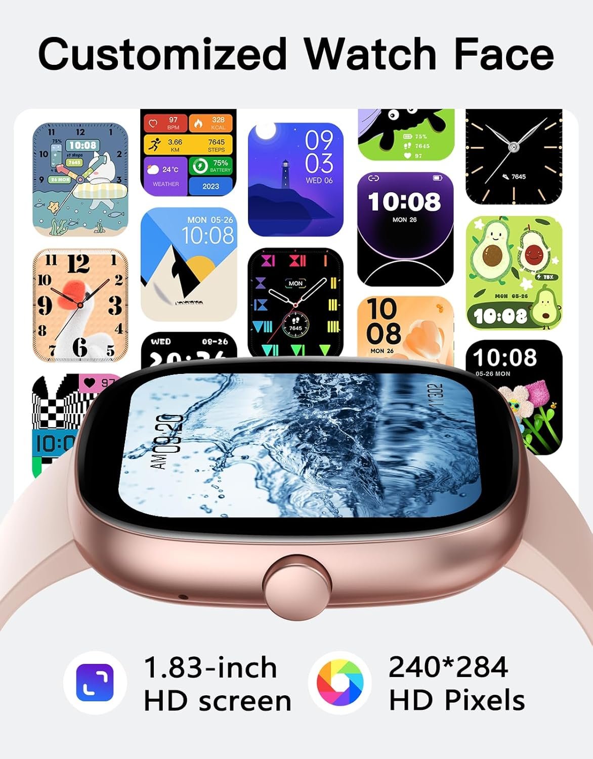 Stylish Fitness Watch for Men and Women: This fitness watch is equipped with a 1.85-inch HD full-touch screen, which gives you super touch screen sensitivity and exceptional image quality. There are 200+ customized watch faces on the dial center(also support uploading pictures), so you can always find a best one to match your style.