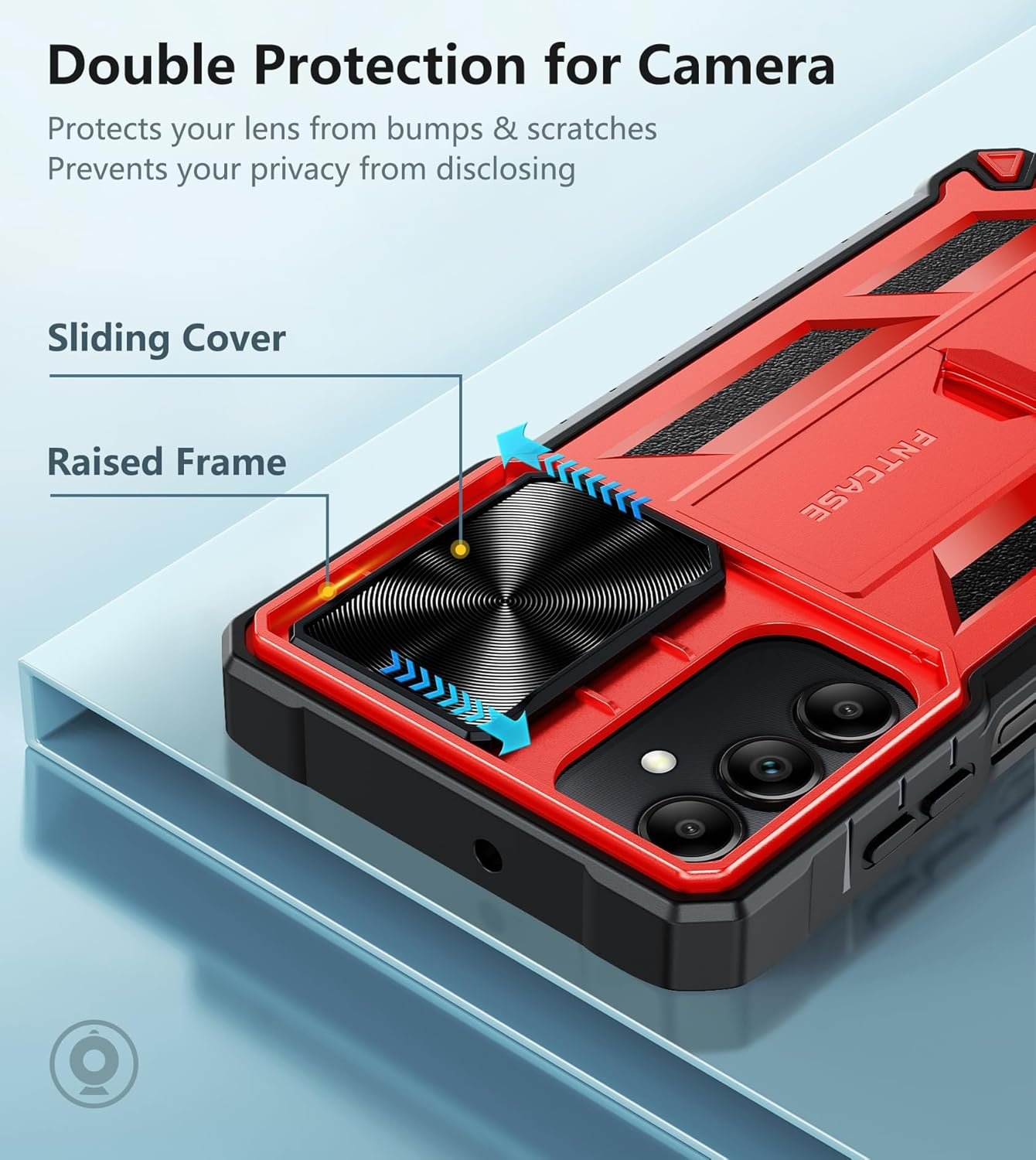Sliding Window Design: Upgraded Anti-Scratch Sliding Camera Protection. The unique design of the camera slide cover, higher than the rear camera lens, protects your A15 phone camera lens against scratches, collision, scuffs, scrapes, and impacts while helping protect your privacy from revealing