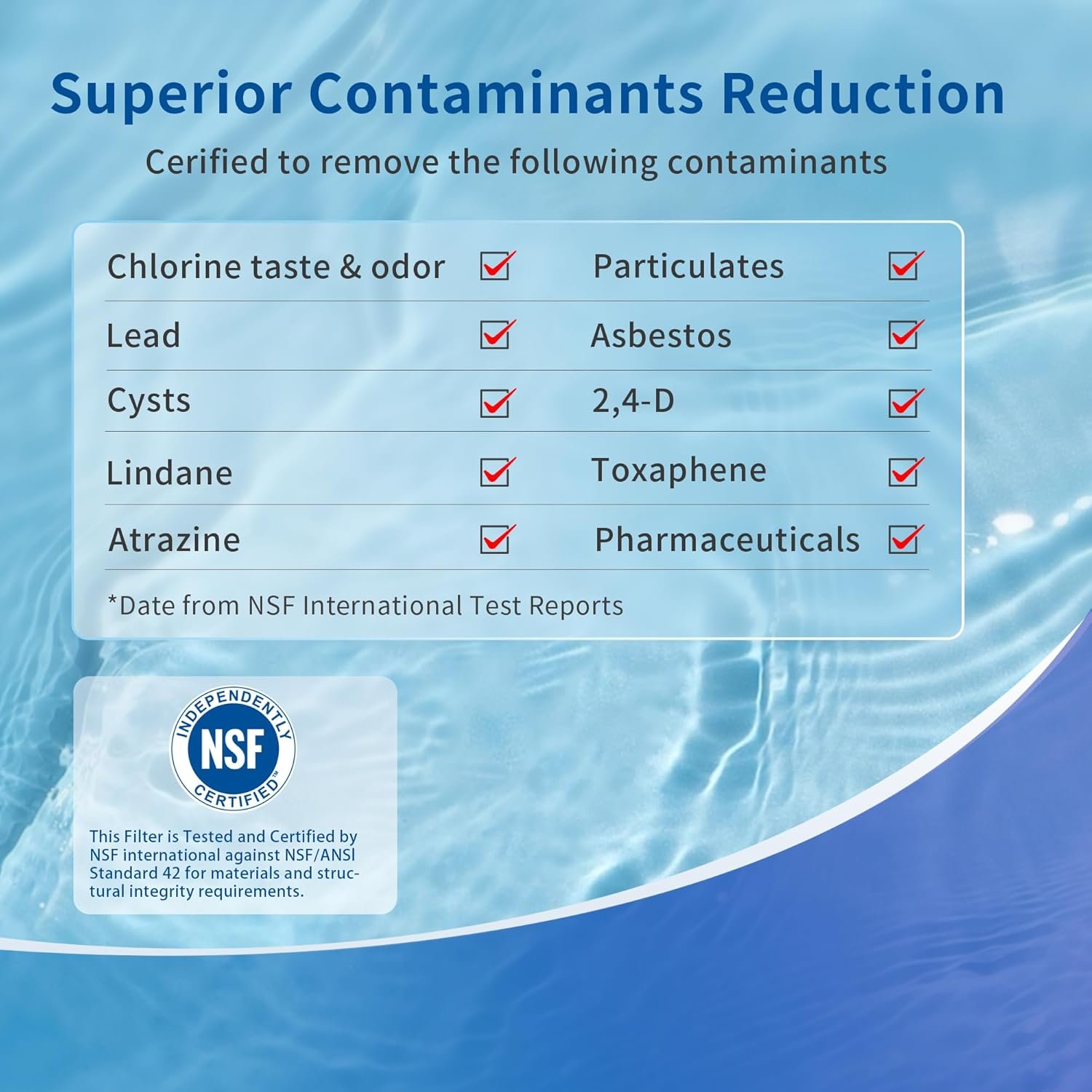 NSF International Certification – Our product has been rigorously tested and certified by NSF/ANSI standards 42, including NSF 42 with Certificate “Xgont WF81” awarded by NSF International, expiring in 2024. This guarantees its superior quality and performance.