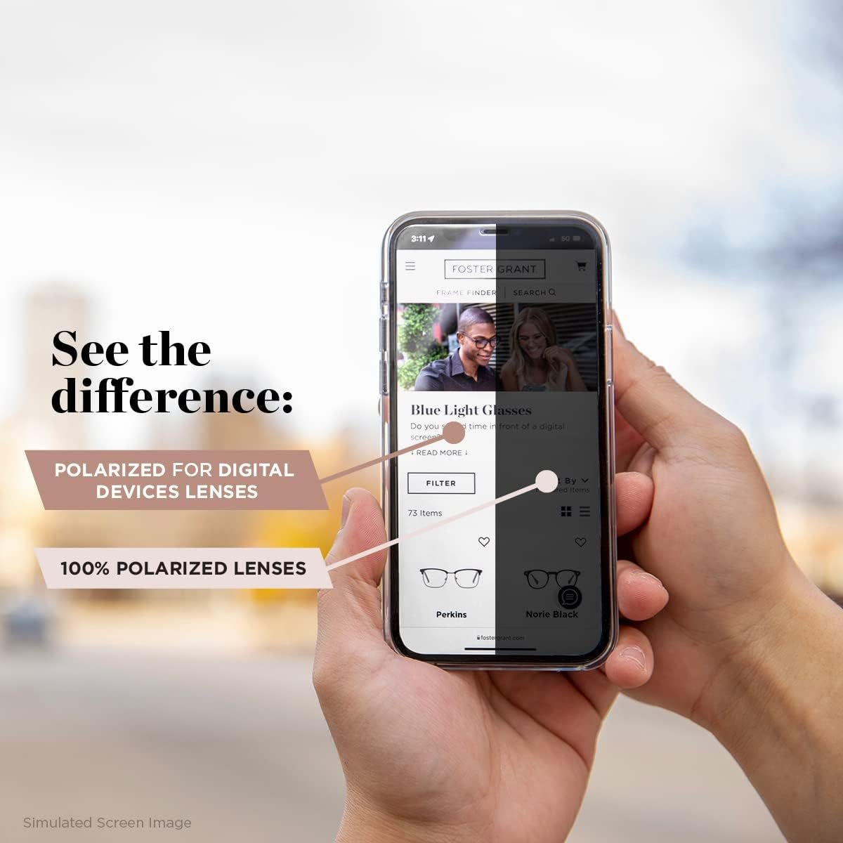 The Foster Grant Addison digital sunglasses for women have a plastic classic square frame and impact-resistant plastic lenses for enhanced visual clarity. The back of the scratch- and smudge-resistant polarized lenses is treated with UV protection coating to prevent light from bouncing back into the eye and protect against eye strain from devices. Worn for 90 years by global icons and trendsetters, Foster Grant sunglasses are the original American sunglasses brand. Now Foster Grant is the market leader in popular-priced eyewear with a full range of sunglasses, reading glasses, and digital glasses. Foster Grant believes in real style – eyewear that is effortlessly fashion-forward and perfectly you, with true quality you can see and feel. Our talented designers in New York, London, and Milan search the globe for the freshest looks and inspiration and transform them into fashion-forward styles that are uniquely flattering and wearable. Every pair of our eyewear is carefully constructed to give you the most comfortable fit. And with every stylish pair affordably priced, you can create all the looks to express the many shades of you.