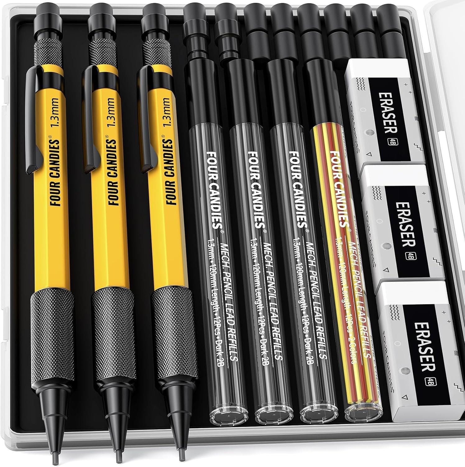 Four Candies 3PCS 1.3mm Mechanical Pencil Set with Case, Metal Heavy Duty Carpenter Pencils with 48 Refill(Red,Black,Yellow) 3Eraser, 12Eraser Refill, Weatherproof Body Outdoor Woodworking Marking